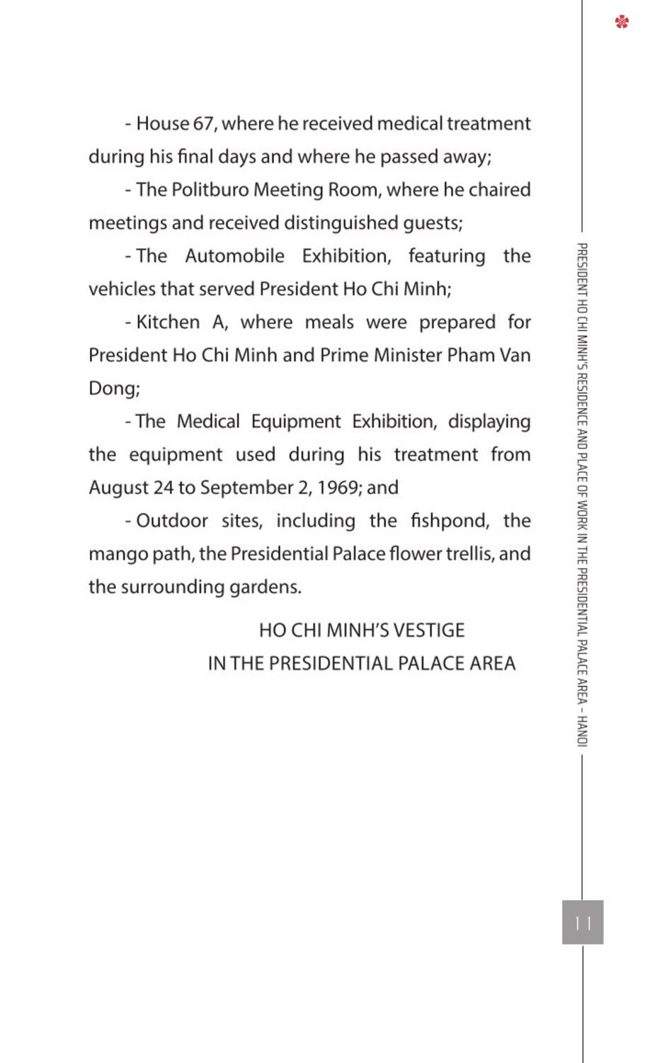 Cuốn sách nhằm giúp bạn đọc hiểu thêm về nơi ở và làm việc của Chủ tịch Hồ Chí Minh, về những giá trị lịch sử - văn hóa của Khu di tích Phủ Chủ