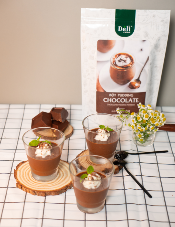 Thành phần: bột kem béo thực vật, bột sữa, đường tinh luyện, bột cacao, chất làm dày(INS 407), chất chống đồng vốn (INS551) màu thực phẩm (INS 102, INS 113) Cách sử dụng bột Pudding chocolate Déli - Chuẩn bị 100g bột pudding chocolate Déli,50g đường cát trắng,800ml nước. - Đun nước chờ đến khi sôi. - Trộn đều hỗn hợp puddingvaf đường rồi cho hỗn hợp vào nước sôi,khấy đều cho tan hỗn hợp trong 3-5 phút, tắt bếp và vớt bọt trên mặt . - Rót dung dịch đã nấu vào khuôn,để nguội rồi cho vào tủ mát chờ pudding đông lại