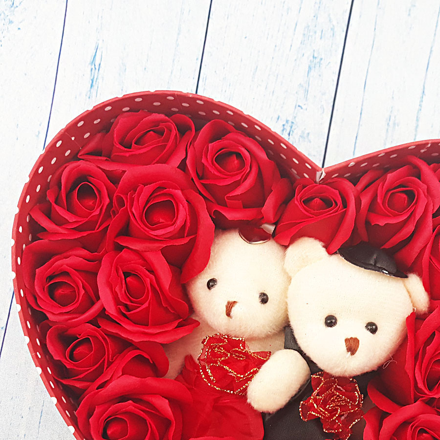 Hoa hồng sáp hộp tim 2 gấu (20 bông), hộp cao - H15 (4 màu)