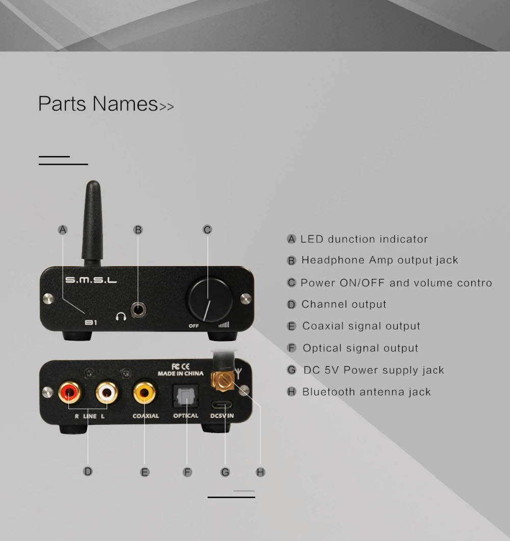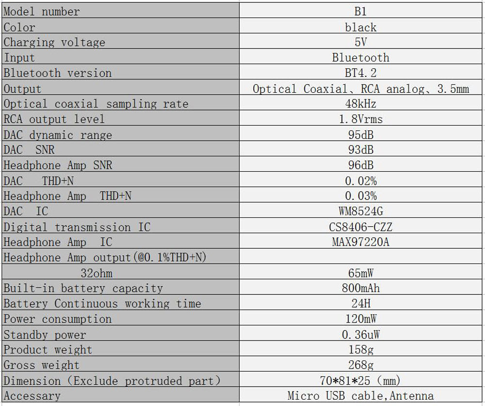 SMSL Audio B1 - Bộ DAC Giải Mã Âm Thanh Bluetooth 4.2 NFC aptX S.M.S.L B1 - DAC Bluetooth 4.2 & NFC, aptX. - Dac Bluetooth 4.2 & NFC, aptX, SMSL Audio B1 - S.M.S.L B1 HiFi Stereo Audio Bluetooth CSR 4.2 Receiver DAC with NFC Lưu ý: Đầu ra RCA không chỉnh được âm lượng, nút chỉnh âm lượng chỉ áp dụng cho cổng 3.5mm cắm tai nghe Đầu thu âm thanh Bluetooth SMSL B1 có công nghệ AptX và cho phép bạn tận hưởng không dây chất lượng cao trên các thiết bị không có tính năng cơ bản này. Nhờ công nghệ Bluetooth 4.2 aptX của nó , không có sự chậm trễ và độ trễ âm thanh trên các thiết bị aptX Certified Low Latency. SMSL B1 được trang bị DAC Wolfson WM8524 , giải mã luồng lên tới 24Bit / 192kHz. Nó cũng có một bộ khuếch đại tai nghe MAX97220A tai nghe lái xe lên đến 32 Ohm / 65mW thông qua đầu ra jack 3.5mm của nó. Chuẩn Bluetooth mới 4.2; Chất lượng cao của âm thanh được truyền tải; Đầu Ra: quang/đồng trục/RCA/3.5mm cổng tai nghe; 24 giờ liên tục phát lại; hơn 10 m khoảng cách truyền dẫn; Hỗ Trợ APT-X-ray truyền tải; Pin sạc 2.5 giờ. B1 là DAC giải mã âm thanh kỹ thuật số chất lượng cao, hỗ trợ bluetooth tín hiệu đầu vào, quang học và đồng trục giao diện kỹ thuật số, các đầu ra kỹ thuật số thuận tiện để lấy bộ giải mã hoặc hỗ trợ quang học/đồng trục giải mã khuếch đại công suất; Giao đầu ra RCA và 3.5mm Tai nghe, RCA đầu ra analog có thể kết nối khuếch đại công suất/loa hoạt động (RCA khối lượng quy định), 3.5mm tai nghe kết nối trực tiếp để nghe; Được thiết kế Pin trong, có thể đạt được 24 giờ sử dụng liên tục, Sử dụng cả ngày để nghe nhạc với thời gian sạc ngắn - Thời gian sạc: 2.5 giờ Lưu ý: xin vui lòng không thường xuyên khởi động tắt máy, khoảng thời gian giữa khởi động bình thường tắt phải được nhiều hơn 3 giây. Đầu ra: quang/đồng trục/RCA/3.5mm tai nghe Hỗ trợ APT-X truyền
