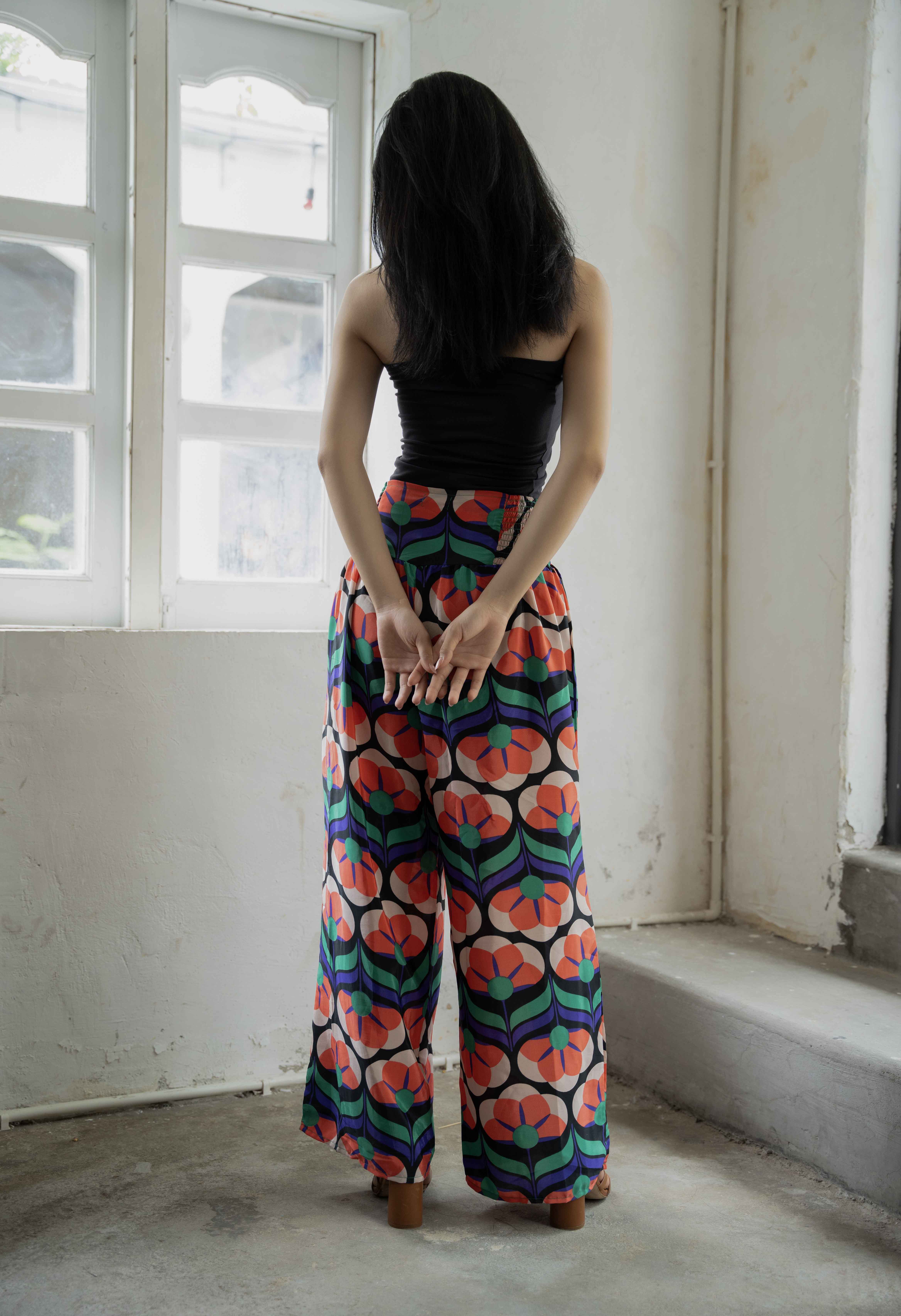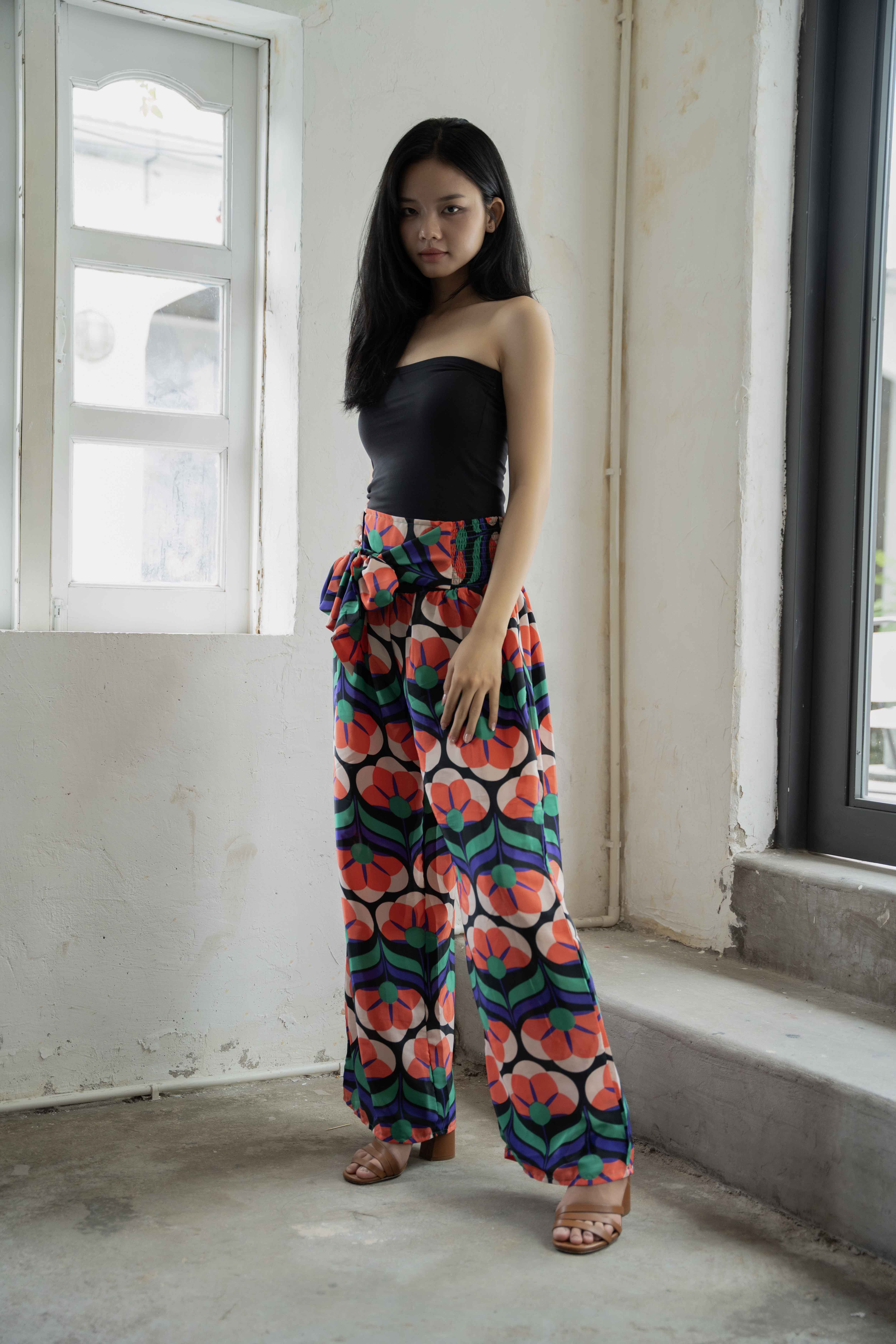 Quần Boho chất liệu lụa mềm mại, họa tiết ấn tượng. Bo thun co giãn ở lưng. Dây cột nơ ở eo (có thể cột phía trước hoặc sau eo). Phom rộng. Dài quần 105cm