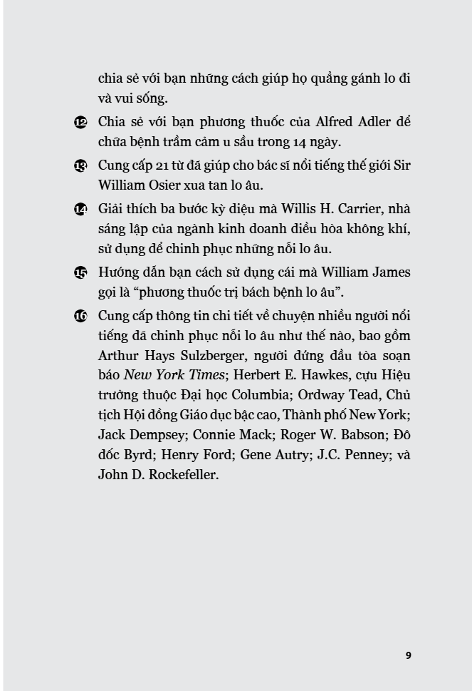 12. Cung cấp 21 từ đã giúp cho bác sĩ nổi tiếng thế giới Sir William Osier xua tan lo âu. 14 Giải thích ba bước kỳ diệu mà Willis H. Carrier, nhà sáng lập của ngành kinh doanh điều hòa không khí, sử dụng để chinh phục những nỗi lo âu.
