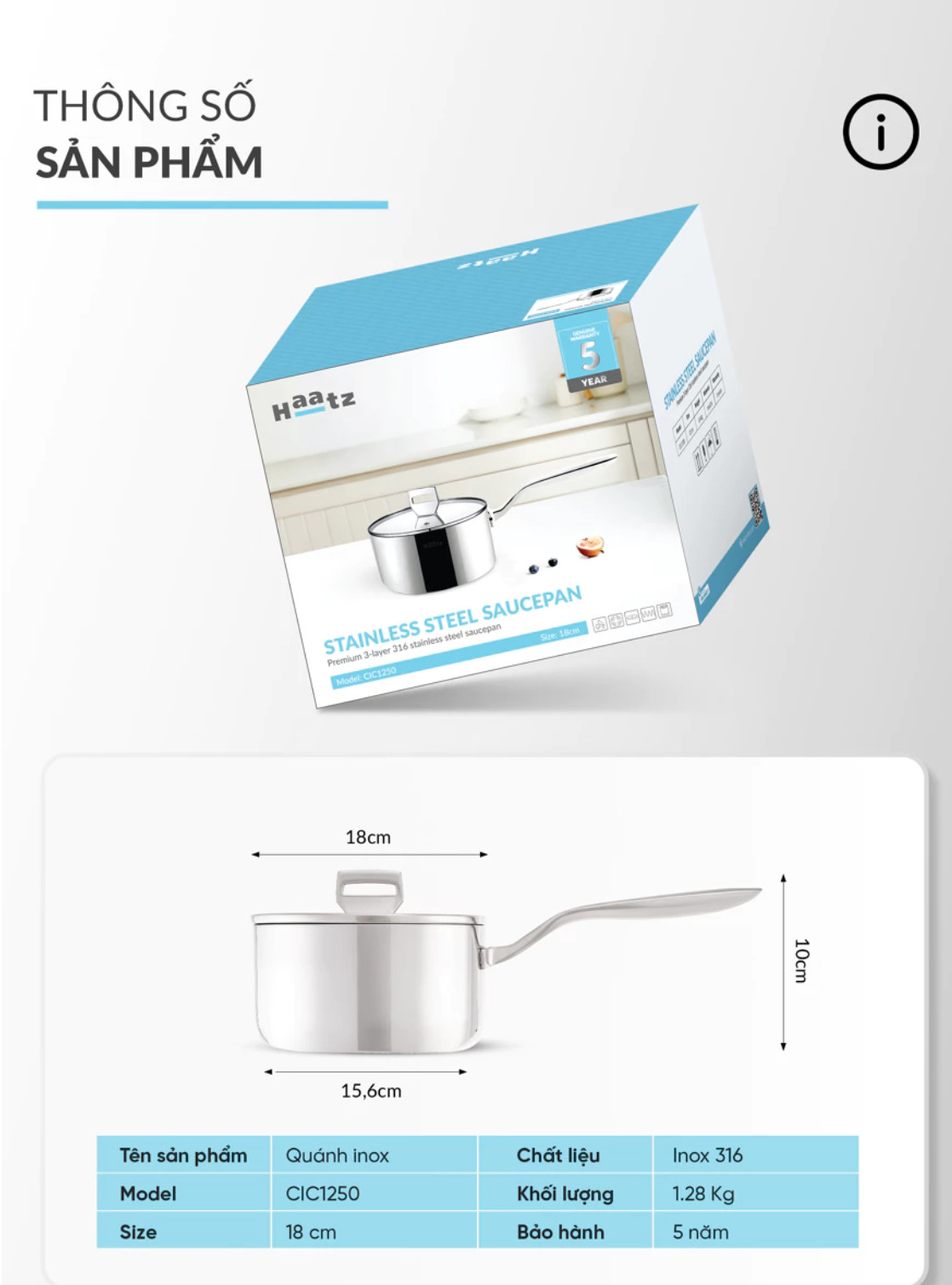 ✨Quánh Inox316 Đúc Đáy Liền 3 Lớp Haatz CIC1250 Size 18cm - Hàng Chính Hãng Bảo Hành 5 Năm