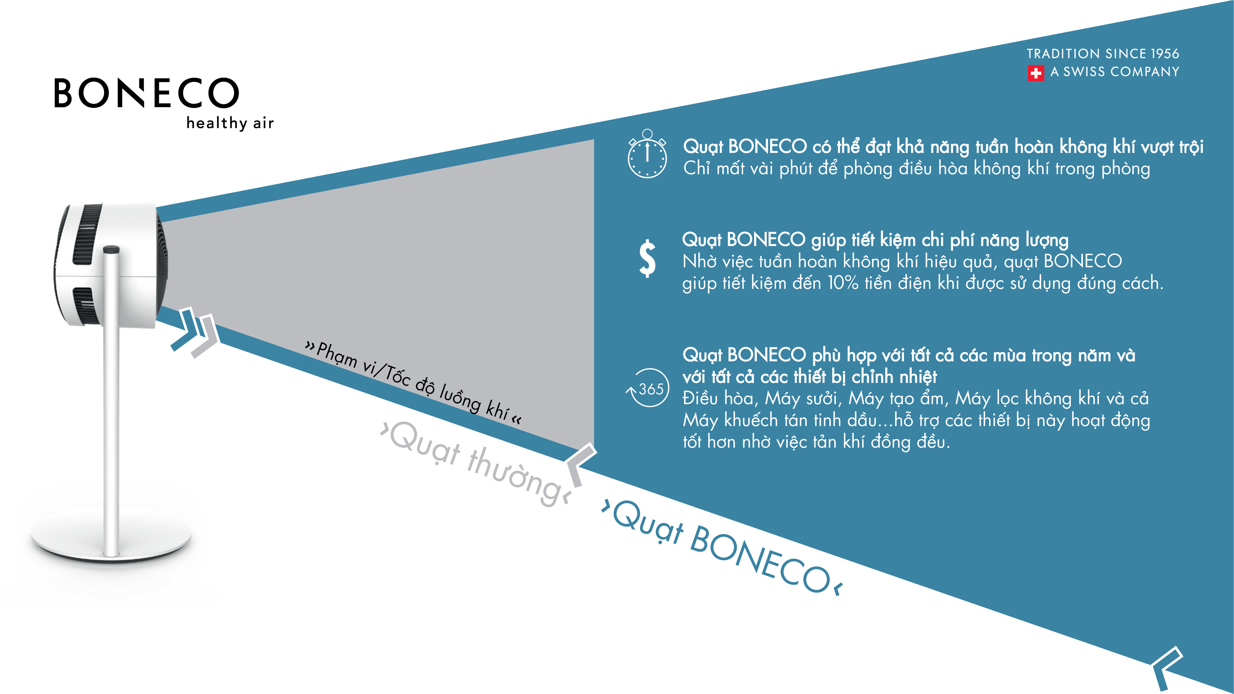 QUẠT ĐIỆN ĐỐI LƯU KHÔNG KHÍ BONECO F230 1. Thông số kỹ thuật Nguồn điện 220 – 240V ~ 50hz Công suất tối đa 33 W Lưu lượng không khí 1260 m³/h Tốc độ dòng khí 3.9