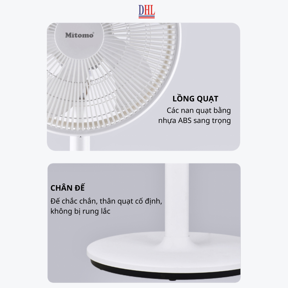 - Model FCE-60HEV ( Quạt cơ thân vuông: Phím cơ, không có điều khiễn, không có hẹn giờ ) Quạt đứng Mitomo FCE- 60AEV/HEV được thiết kế đơn giản, hiện đại với tông màu trắng chủ đạo. Thân quạt và lòng quạt được thiết kế từ nhựa ABS mang lại vẻ sang trọng và chắc chắn. Quạt có điều khiển từ xa, tích hợp chức năng hẹn giờ tiện dụng. Ba cấp độ gió cùng tính năng xoay đa hướng giúp gió phủ rộng và đều hơn. Tính năng nổi bật của quạt đứng Mitomo FCE-60HEV chính hãng