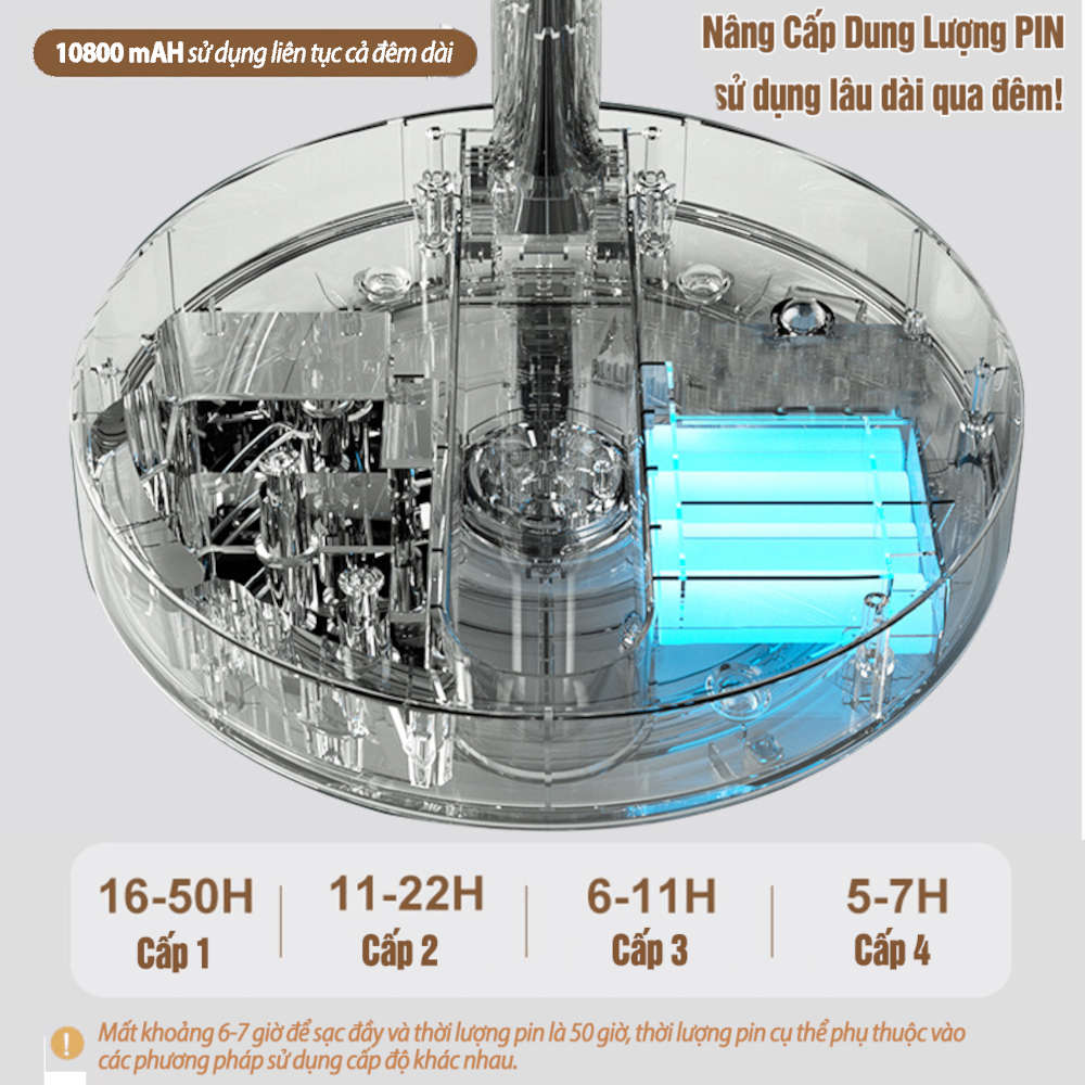 • Quạt tích hợp loại Pin lithium 18650 cao cấp siêu bền bỉ với dung lượng 10800mAh cho bạn thời gian sử dụng thoải mái tới 50h trong những ngày mất điện, hay đi chơi, đi pic nic ...
