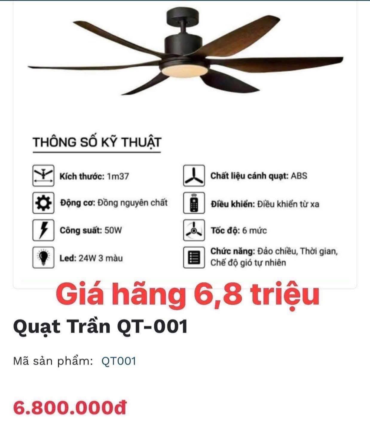 Quạt trần 6 cánh có đèn trang trí trần nhà phòng khách cánh dài có điều khiển bảo hành 48 tháng Quạt trần trang trí phòng khách Thông Số kỹ thuật : Đường kính :