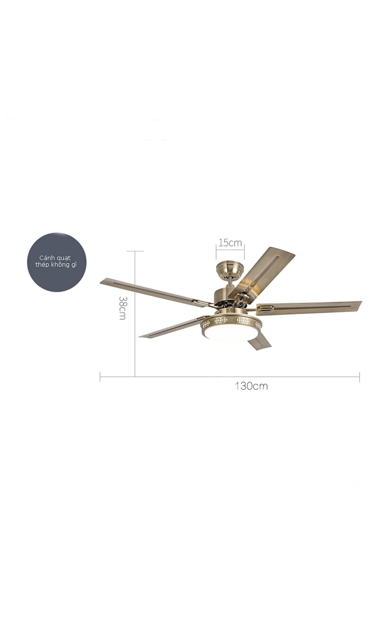 Màu sắc :Đồng xanh Sải cánh : 1320mm Động cơ: 153x15mm Công suất : 75W AC Chất liệu cánh : 5 cánh thép Chao đèn: 5 đèn Ánh sáng : có