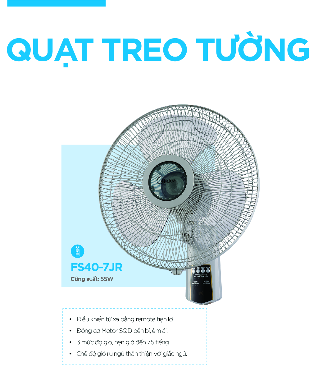 Mua tại TiktokQuạt Treo Tường 3 Cánh - 55w Midea FW40-7JR Có chế độ gió tự nhiên và chế độ gió ru ngủ, êm dịu cho người dùng Thiết kế nhỏ gọn của quạt FW40-7JR giúp người dùng có thể treo quạt một cách dễ dàng, tiết kiệm diện tích. Với động cơ bạc thau, có công suất 55W, giúp quạt hoạt động cực êm ái. Có các chế độ thông minh như gió tự nhiên, gió ru ngủ, cho người dùng có một cảm giá mát mà không rét lạnh, dịu dàng và êm ái.