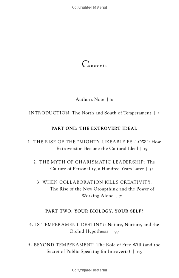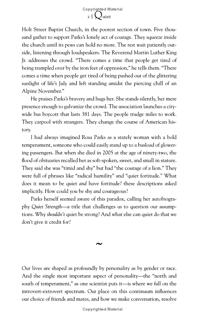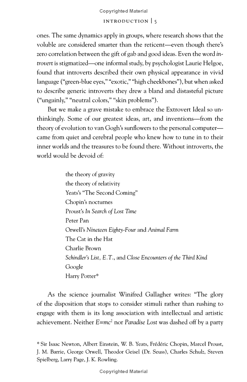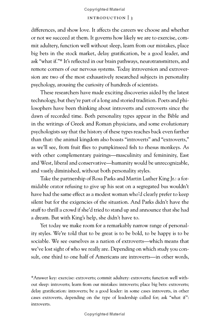 At least one-third of the people we know are introverts. They are the ones who prefer listening to speaking; who innovate and create but dislike self-promotion; who favor working on their own over working in teams. It is to introverts-Rosa Parks, Chopin, Dr. Seuss, Steve Wozniak-that we owe many of the great contributions to society.