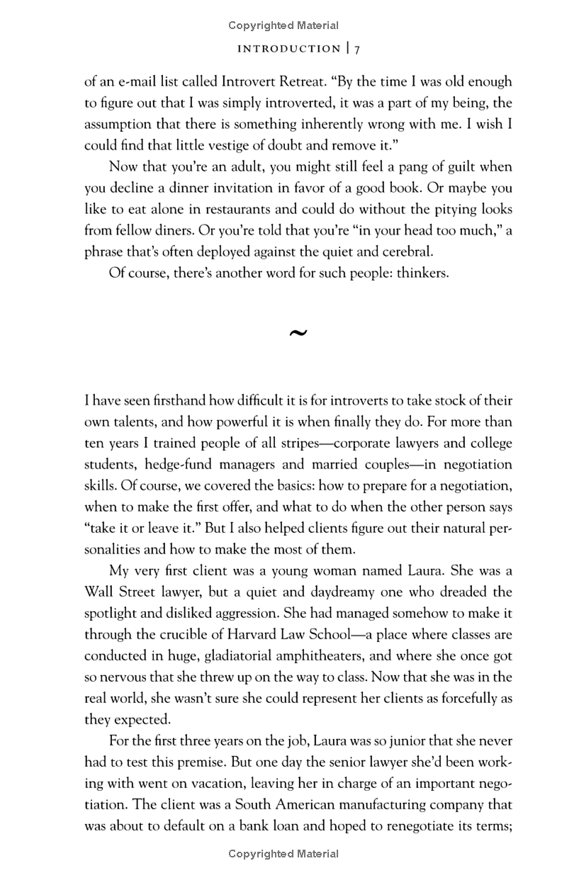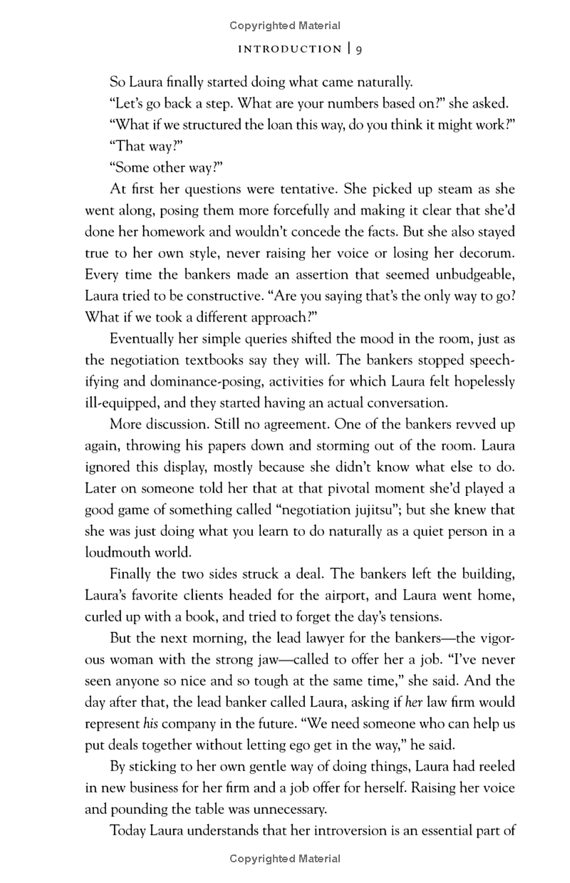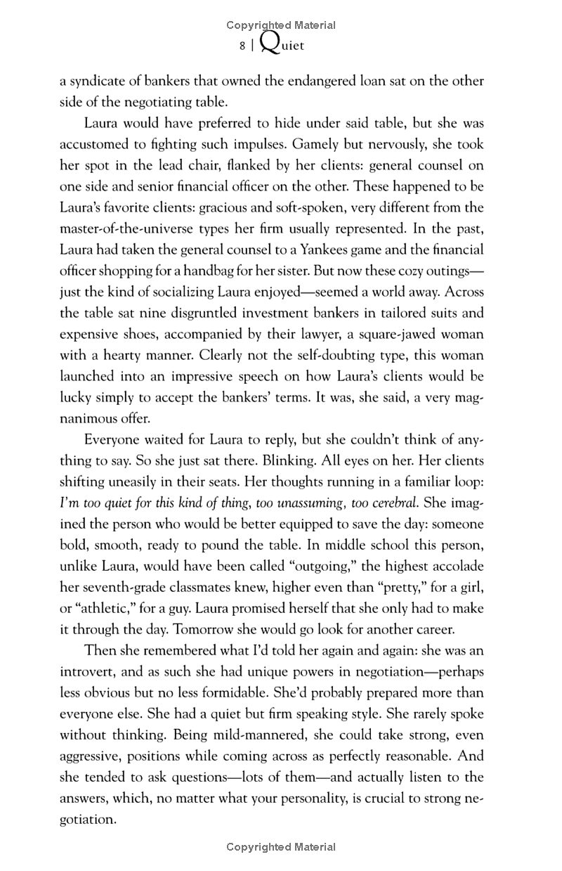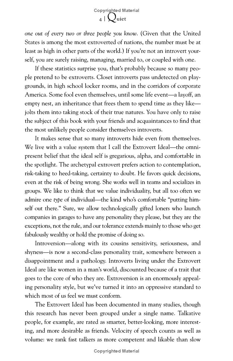 In Quiet, Susan Cain argues that we dramatically undervalue introverts and shows how much we lose in doing so. She charts the rise of the Extrovert Ideal throughout the twentieth century and explores how deeply it has come to permeate our culture. She also introduces us to successful introverts-from a witty, high-octane public speaker who recharges in solitude after his talks, to a record-breaking salesman who quietly taps into the power of questions. Passionately argued, superbly researched, and filled with indelible stories of real people, Quiet has the power to permanently change how we see introverts and, equally important, how they see themselves.