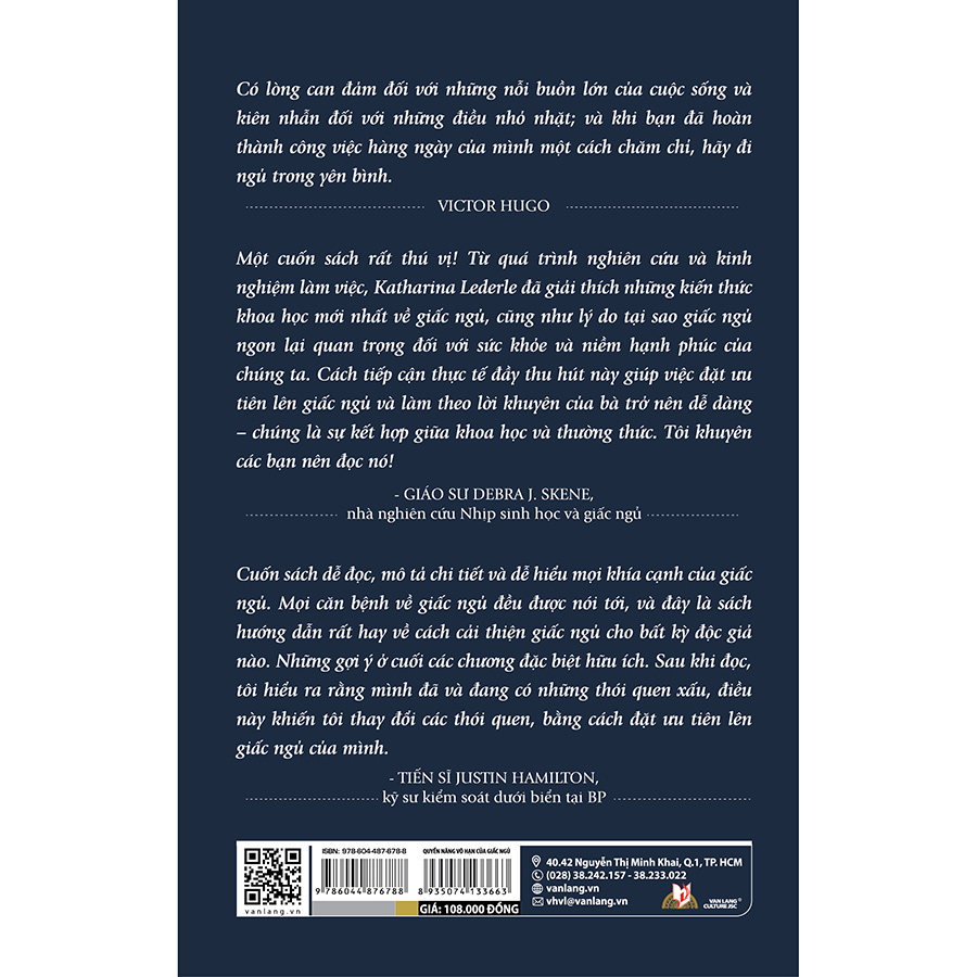Một cuốn sách rất thú vị! Từ quá trình nghiên cứu và kinh nghiệm làm việc, Katharina Lederle đã giải thích những kiến thức khoa học mới nhất về giấc ngủ, cũng như lý do tại sao giấc ngủ ngon lại quan trọng đối với sức khỏe và niềm hạnh phúc của chúng ta. Cách tiếp cận thực tế đầy thu hút này giúp việc đặt ưu tiên lên giấc ngủ và làm theo lời khuyên của bà trở nên dễ dàng – chúng là sự kết hợp giữa khoa học và thường thức. Tôi khuyên các bạn nên đọc nó! - Giáo sư Debra J. Skene, nhà nghiên cứu Nhịp sinh học và giấc ngủ