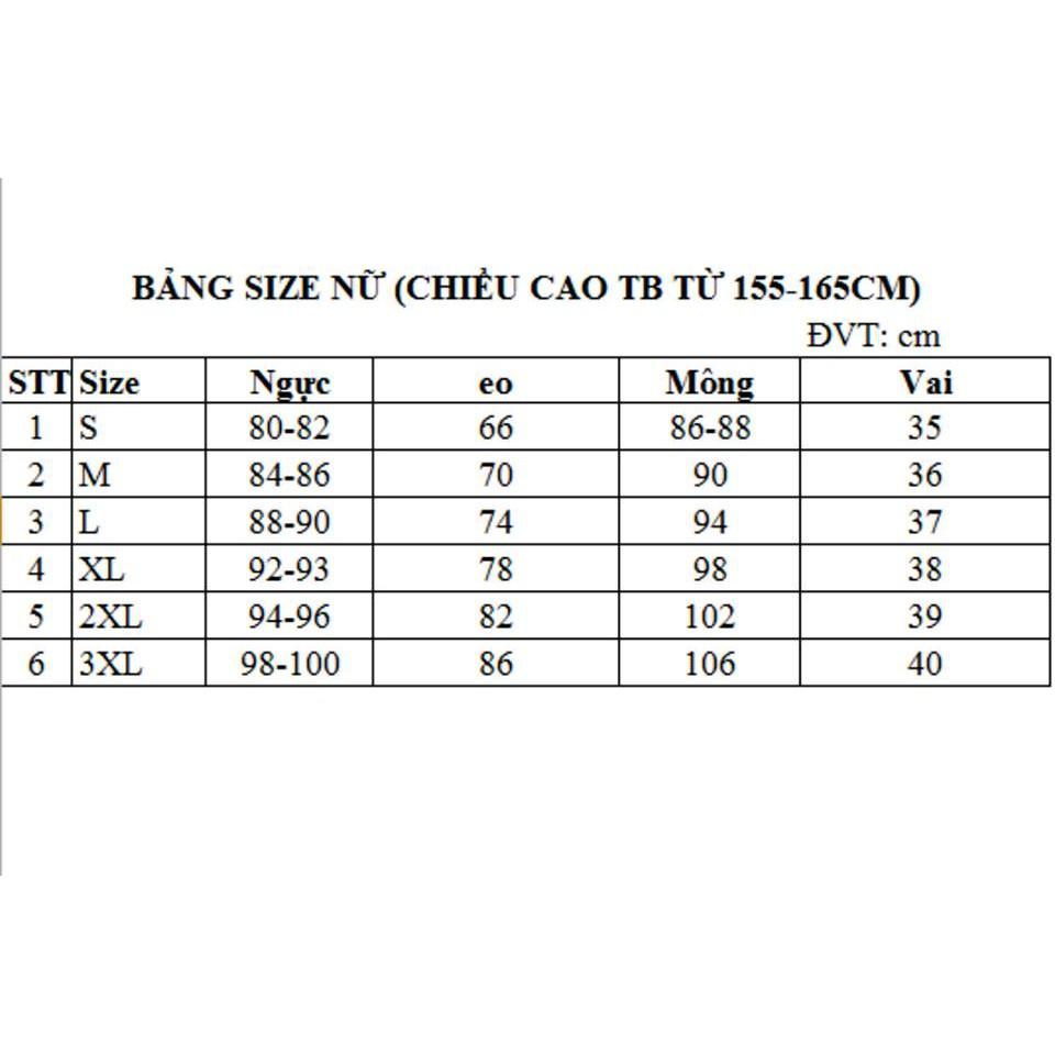 XL : ngực 92cm; vai 38cm; eo 78cm; mông 98cm ; cao 155-160cm