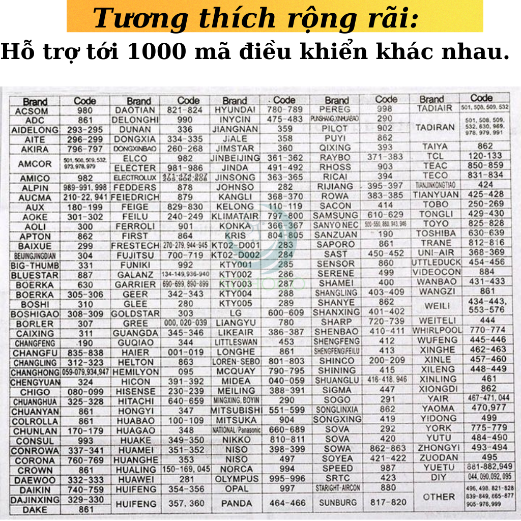 - Tương thích: Hơn 1000 loại điều hòa của các thương hiệu như Daikin, Panasonic, LG, Toshiba, Sharp, Gree, Midea, Samsung, TCL...