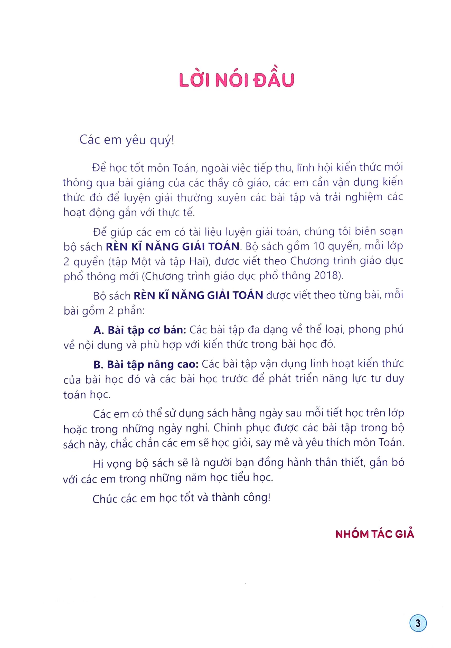Để giúp các em có tài liệu giải toán, chúng tôi biên soạn bộ sách Rèn Kĩ Năng Giải Toán. Bộ sách gồm 10 quyển, mỗi lớp 2 quyển (tập Một và tập Hai), được viết theo chương trình giáo dục phổ thông mới (Chương trình giáo dục phổ thông 2018)