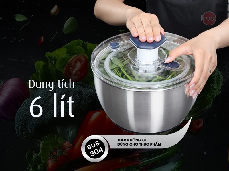 Với rổ quay rau iMat, mọi thứ đơn giản hơn nhiều: chỉ cần bơm – và bơm, bạn sẽ có ngay phần rau ráo nước tới 72% mà không cần dùng lực. Cơ chế bơm lực quay ly tâm tạo tốc độ lên đến 500 vòng/phút khi có rau (và tới 700 vòng/phút khi không tải), giúp đẩy nước ra khỏi bề mặt lá rau nhanh chóng, nhẹ nhàng mà vẫn giữ nguyên độ giòn và tươi của rau.