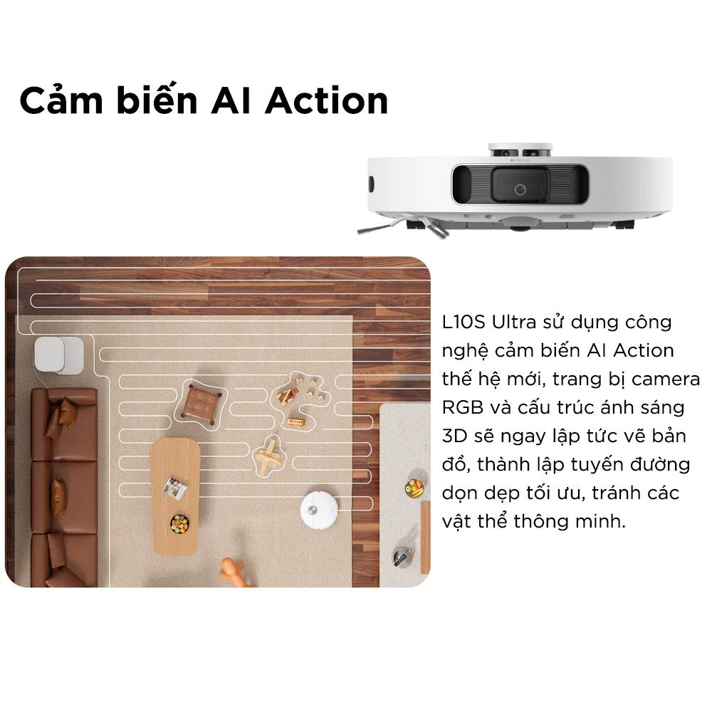 Tích hợp công nghệ Quét laser 3D định vị hệ thống hiển thị bản đồ toàn bộ ngôi nhà. Chốt quét: 2 chiếc Tự động quay về dock sạc, leo dốc 3cm. Thời gian sạc