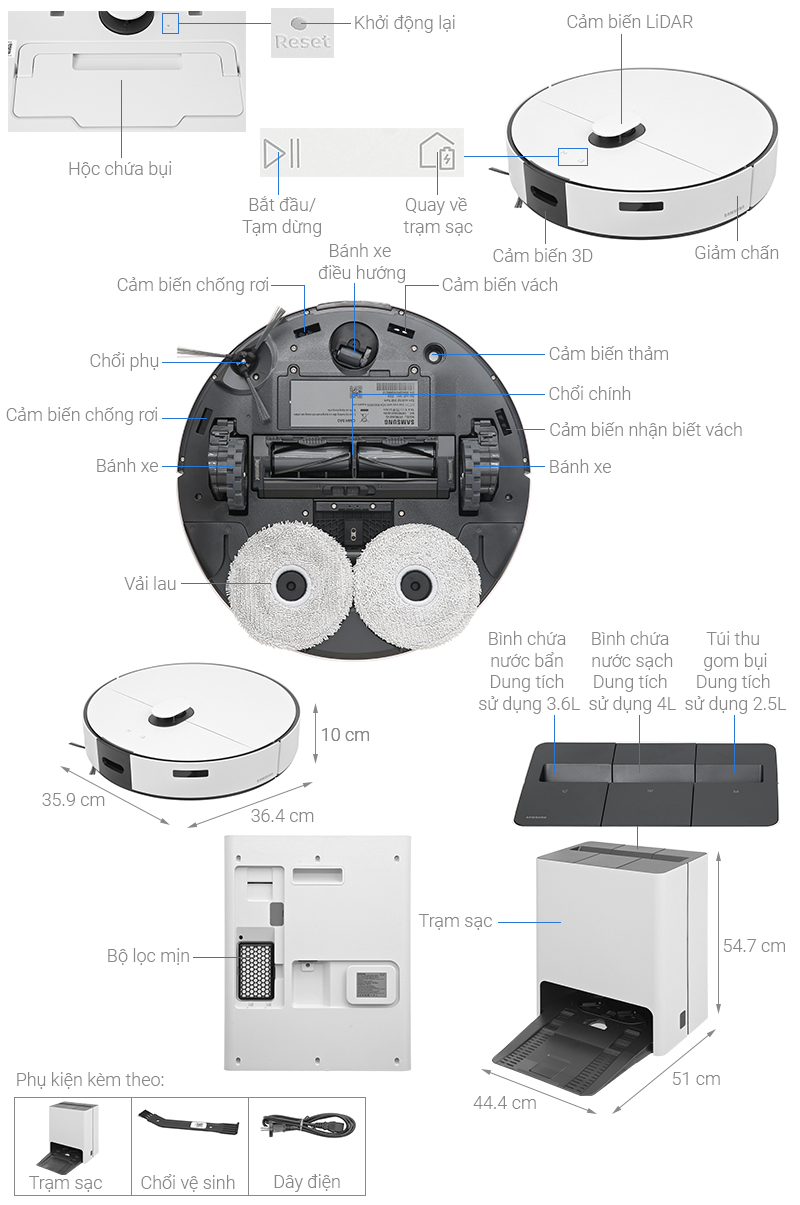 Tiện ích: Cảm biến chống rơi, chống va chạm, Điều khiển qua kết nối trên điện thoại thông minh, Tự động đổ bụi, giặt, sấy khô vải lau, Tự quay về đế/trạm sạc, Trạm sạc kết hợp thu gom bụi, Lưu được 4 bản đồ, Tính năng tường ảo, Vừa hút vừa lau nhà, Ghi nhớ khu vực chưa vệ sinh, Hẹn giờ Thông tin lắp đặt