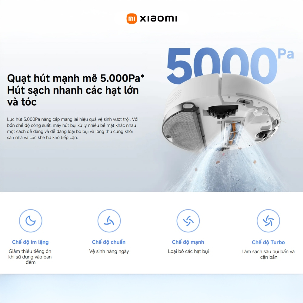 - Hút và lau mạnh mẽ: Trang bị lực hút 5.000Pa, dễ dàng loại bỏ hạt lớn và tóc, với 4 chế độ công suất.