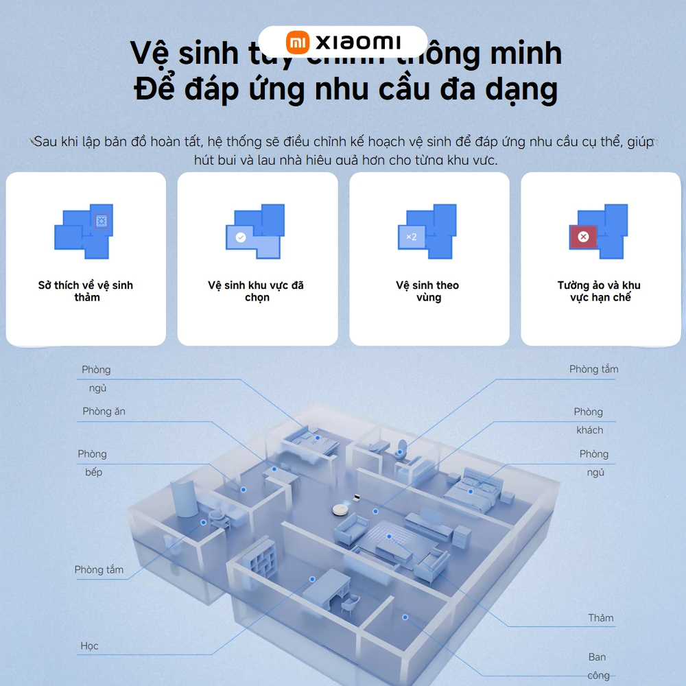 - Vệ sinh tùy chỉnh thông minh: Lên kế hoạch dọn dẹp theo nhu cầu cụ thể, bao gồm khu vực, thảm, tường ảo.