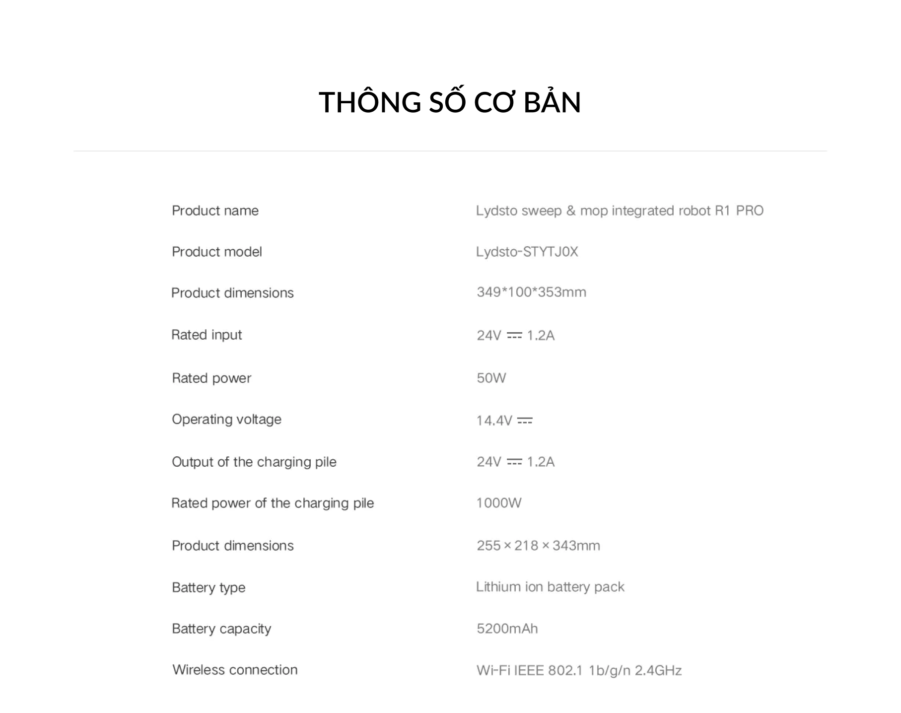 Màu sắc Trắng Loại điều hướng LDS Điều khiển bằng giọng nói YIKO 2.0 Lực hút robot 11.000Pa Độ ồn 65dB Loại pin Li-on Dung lượng pin 6400mAh Thời gian sạc ~3.1 giờ Công