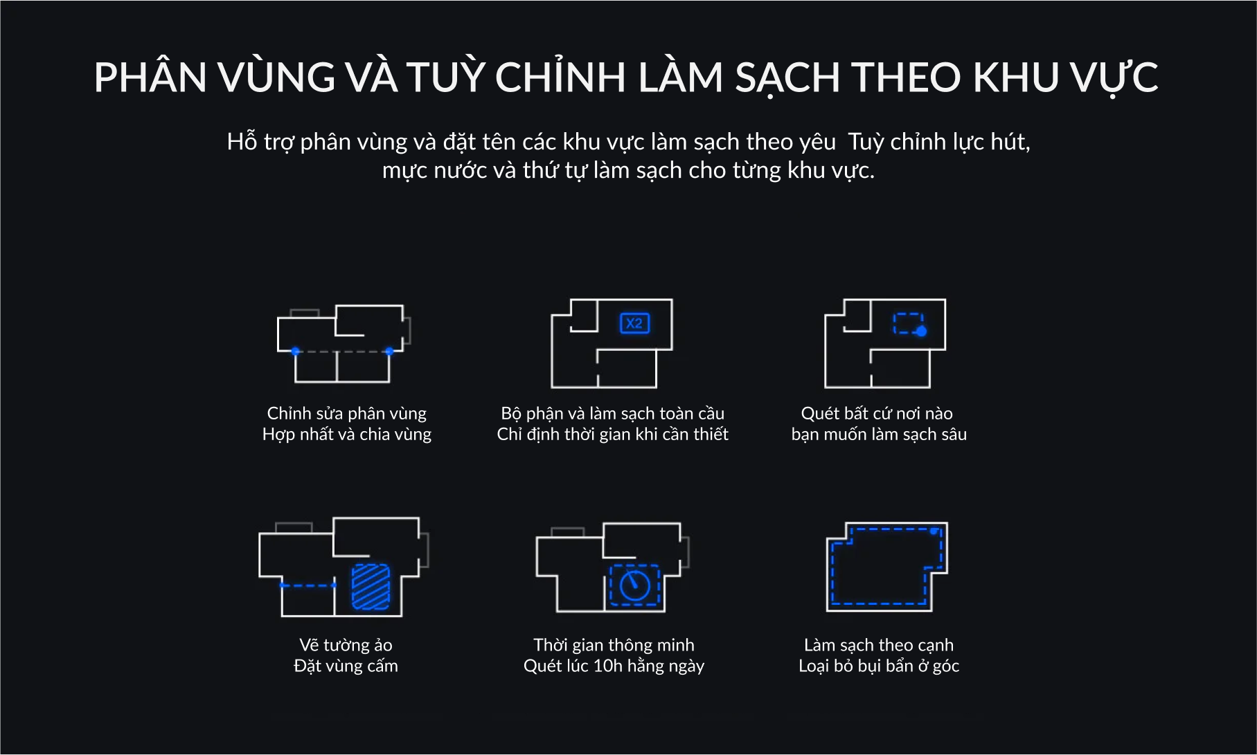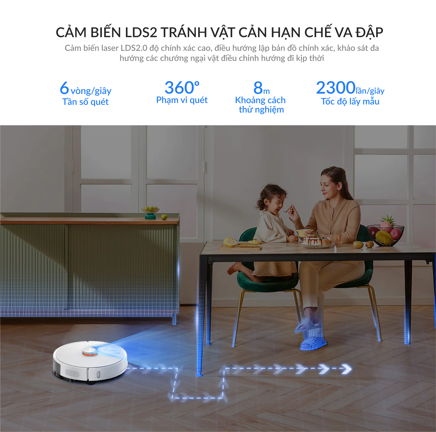 Tích hợp công nghệ Quét laser 3D định vị hệ thống hiển thị bản đồ toàn bộ ngôi nhà. Chốt quét: 2 chiếc Tự động quay về dock sạc, leo dốc 3cm. Thời gian sạc