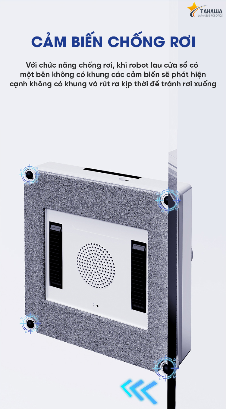 - Di chuyển tổng hợp giúp cho cửa kính nhà bạn không bị bỏ sót điểm nào Ngoài ra, robot còn tích hợp bộ nhớ để tự động quay về vị trí ban đầu sau khi làm việc. Robot Lau Kính Tahawa TH-YW509 - cảm biến chống rơi hiện đại Robot lau kính Tahawa TH-YW509 được trang bị chip điều khiển thông minh và cảm biến gia tốc sáu trục, giúp máy hoạt động hiệu quả. Ngoài ra, hệ thống cảm biến chuyển động khung cửa sổ đảm bảo an toàn và chính xác trong quá trình làm việc. Tốc độ làm sạch nhanh TH-YW509 sở hữu khả năng làm sạch kính nhanh chóng lên tới 2,4 phút trên 1 mét vuông. Từ đó có thể vệ sinh những tấm kính lớn 1 cách nhanh chóng. Robot Lau Kính Tahawa TH-YW509 - Khả năng hút chân không lớn Với khả năng hút chân không 3200pa, robot lau kính Tahawa TH-YW509 có thể chịu tải trọng 6000g theo phương thẳng đứng. Điều này giúp tăng ma sát giữa kính và máy, tránh trượt trên kính ướt và đảm bảo quá trình lau cửa sổ ổn định hơn. Hoạt động được trên nhiều bề mặt kính khác nhau Robot lau kính Tahawa TH-YW509 có thể làm việc được trên nhiều bề mặt kính khác nhau, thậm chí máy còn cho khả năng lau sạch trên bề mặt gạch men ốp tường và đá hoa cương. Robot Lau Kính Tahawa TH-YW509 - Điều khiển bằng remote và app Robot lau kính Tahawa TH-YW509 có thể được điều khiển bằng remote hoặc qua ứng dụng di động. Việc điều khiển dễ dàng và thuận tiện giúp bạn sử dụng máy một cách linh hoạt. Bộ khăn lau đặc biệt liền mảnh Robot lau kính của Tahawa được tích hợp với bộ lau vách siêu sạch, được chế tạo từ chất liệu microfiber đặc biệt. Điều này giúp cho robot Tahawa TH-YW509 có khả năng loại bỏ bụi bám trên tấm kính một cách sạch sẽ và hiệu quả. Bên cạnh đó, Tahawa TH-YW509 còn được trang bị một bộ vỏ hút an toàn và dây buộc, giúp ngăn chặn robot rơi xuống hoặc rơi ra ngoài cửa sổ. Ngay cả khi thiết bị tách ra khỏi kính, bạn cũng không cần phải lo lắng về sự an toàn của nó trong quá trình lau dọn nhà cửa. Bộ Phụ Kiện Chính sách bảo hành, hàng nhập khẩu chính hãng