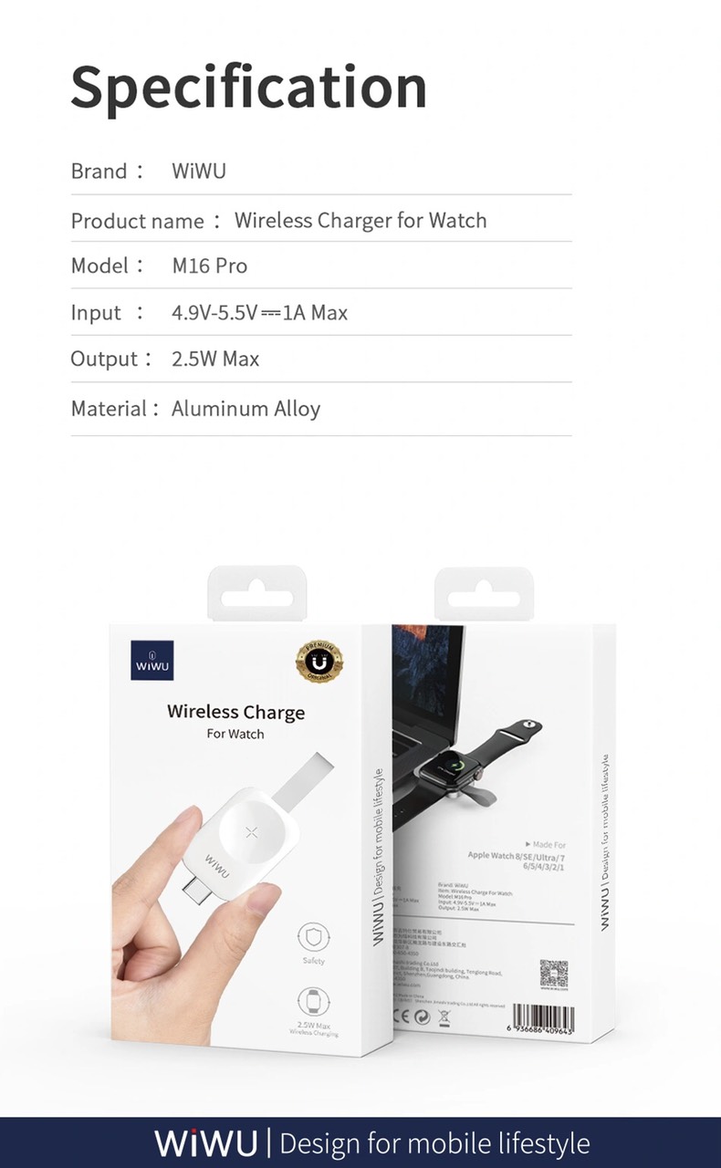 Thông tin sản phẩm : Cáp sạc cho Đồng hồ thông minh Watch Series 7 , 6 , SE, 5 ,4 , 3 , 2 – Series 1 Bản thép Chính hãng Wiwu Wireless Charge