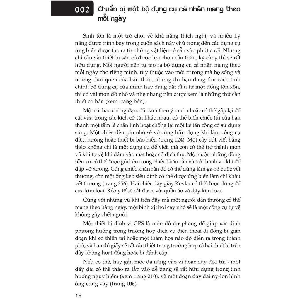 - Số trang: 272 100 KỸ NĂNG SINH TỒN – CUỐN CẨM NANG HƯỚNG DẪN VỀ CÁCH SỐNG SÓT Ở NƠI HOANG DÃ VÀ CHUẨN BỊ CHO MỌI THẢM HỌA Được viết bởi Clint Emerson – một cựu Đặc vụ SEAL, lực lượng tác chiến đặc biệt của Hải quân Hoa Kỳ, cuốn sách 100 kỹ năng sinh tồn của Đinh Tị Books là một trong những cuốn sách bán chạy của New York Times. Rõ ràng, chi tiết và được trình bày dễ hiểu, cuốn sách phác thảo những chiến lược cơ bản nhưng thiết thực giúp bảo vệ bản thân và thoát khỏi những tình huống khó khăn và nguy cấp nhất. Tác giả của cuốn sách là một cựu Đặc vụ SEAL, ông đã dành hai mươi năm chỉ đạo những chiến dịch đặc biệt trên khắp thế giới trong lúc còn gắn bó với Đội Ba SEAL, Cơ quan An ninh Quốc gia Hoa Kỳ (NSA), và Đội Sáu SEAL tinh nhuệ. Những kỹ năng bổ ích của cuốn sách "100 kỹ năng sinh tồn" như thế nào? Những kỹ năng được giới thiệu trong cuốn sách “mang tính sống còn” vì một lí do. Nhiều trong số đó được lấy cảm hứng từ những nhiệm vụ và sự huấn luyện đặc biệt của những đặc vụ thường xuyên bị đẩy đến giới hạn của sức chịu đựng, sự chuẩn xác và tài xoay xở khéo léo trong những điều kiện hiểm nghèo đe dọa đến tính mạng. Một xã hội ngày càng được kết nối toàn cầu đòi hỏi sự chỉ dẫn mới để tồn tại. Bạn sẽ làm gì nếu như một ngày bạn và những người thân yêu bị mắc kẹt giữa vùng lãnh thổ có dịch bệnh hoành hành, lạc ở nơi hoang dã, hay bị móc túi khi đi du lịch ở đất nước xa lạ? Bạn sẽ phản ứng ra sao khi bạn phải thoát ngay khỏi một vụ hỏa hoạn ở nhà cao tầng, bạn phải làm gì để cứu người thân đang mắc kẹt trong vụ hỏa hoạn đó…? Bản kế hoạch thu nhỏ? Tại sao không? Cuốn sách là một bản kế hoạch chi tiết đưa chúng ta trở về những cốt lõi của những kỹ năng đã mất, dạy chúng ta cách xác định phương hướng ở những nơi thiếu vắng các biển báo đường phố hay tín hiệu vệ tinh, đồng thời chuẩn bị cho chúng ta đối mặt với nhiều mối đe dọa mới xuất hiện trong môi trường mà chúng ta đang sống. Rõ ràng, chi tiết và được trình bày dễ hiểu, cuốn sách phác thảo nhiều chi tiết chiến lược giúp bảo vệ bạn và những người bạn yêu thương vượt qua những tình huống khó khăn, nguy hiểm nhất với một sự chuẩn bị cả về vật chất và tinh thần bình tĩnh. Cuốn sách dạy bạn cách suy nghĩ và hành động như một thành viên của lực lượng quân đội tinh nhuệ Hoa Kỳ. Kết Luận Chỉ những sinh vật mạnh mẽ mới có thể sống sót, chỉ những người thông thạo và hiểu biết mới có thể phát triển. Thế giới này chưa từng trở nên an toàn hơn, vì vậy bạn hãy sẵn sàng để luôn đứng vững. Và hãy để cho cuốn sách “100 kỹ năng sinh tồn” chỉ đường cho bạn.