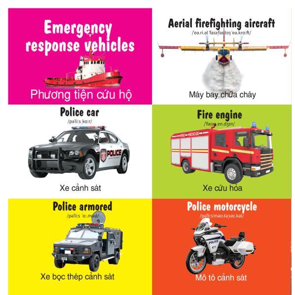 Bộ sách gồm 4 cuốn: số đếm, động vật, phương tiện giao thông, bảng chữ cái màu sắc hình dạng