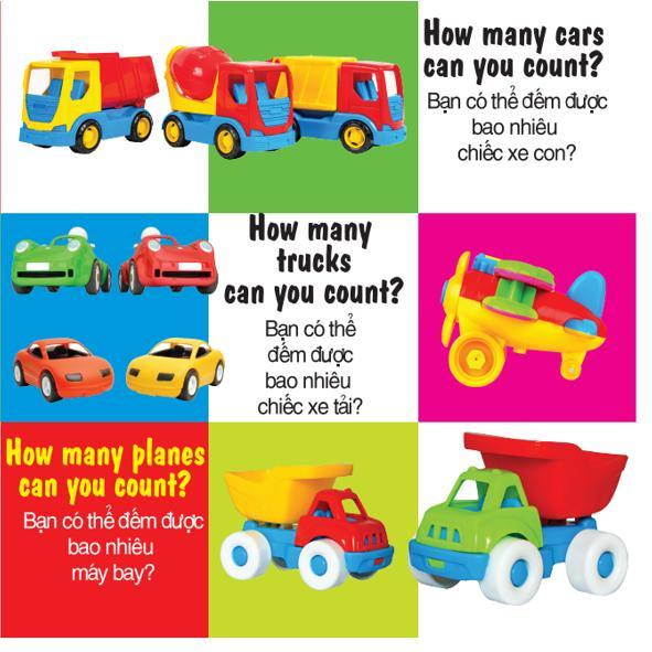 Bộ sách gồm 4 cuốn: số đếm, động vật, phương tiện giao thông, bảng chữ cái màu sắc hình dạng