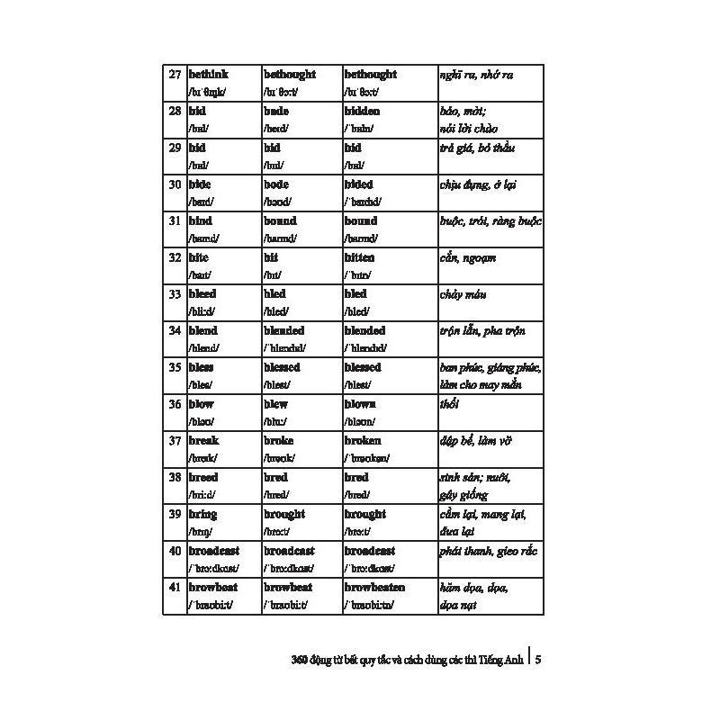 Bảng động từ bất quy tắc đầy đủ 360 động từ bất quy tắc tiếng Anh thường gặp | 360 Irregular Verbs