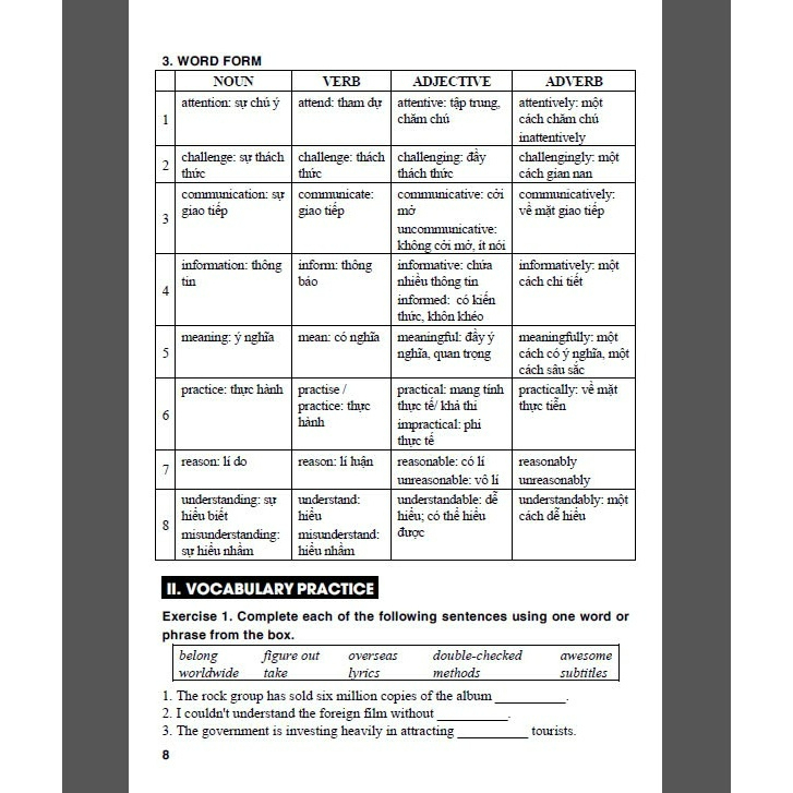 II. Vocabulary Practice: các bài luyện tập giúp học sinh ghi nhớ và nắm vững cách dùng các từ ngữ mới.