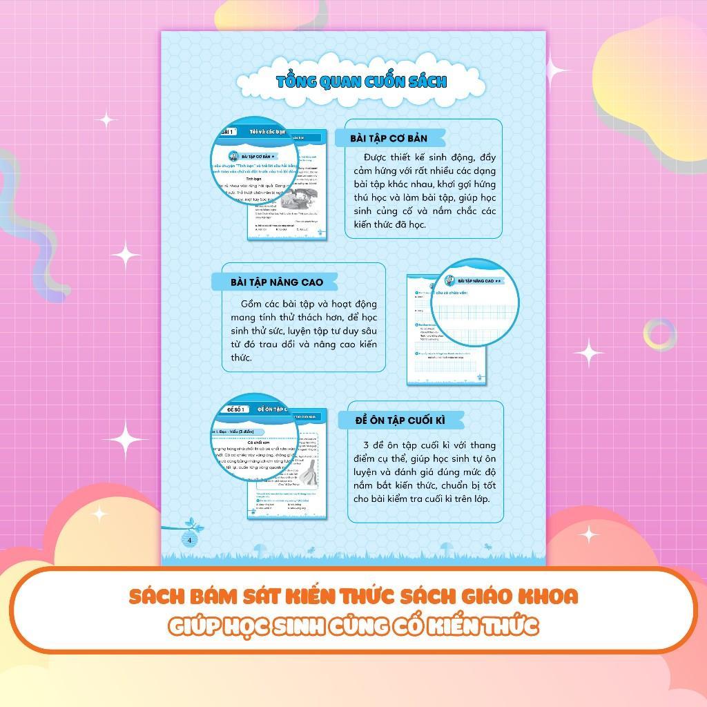 Các bài tập trong phần này được thiết kế sinh động, đầy cảm hứng với rất nhiều các hoạt động nối, tô màu, gạch chân,.. giúp khơi gợi hứng thú học và làm bài tập của các em, đồng thời giúp các em củng cố và nắm chắc các kiến thức đã học.