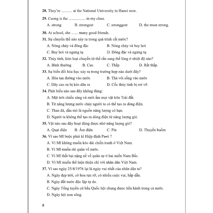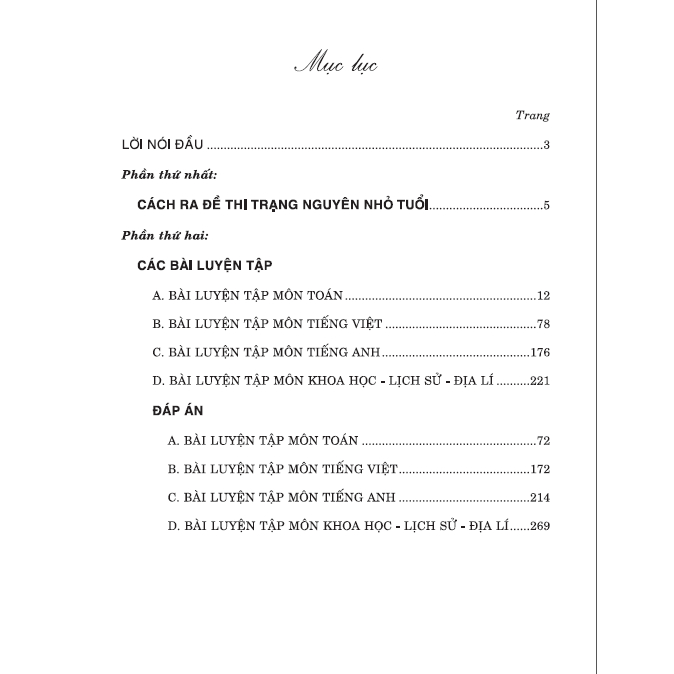 Các em học sinh yêu quý! “Trạng nguyên nhỏ tuổi” là cuộc thi do Báo Nhi đồng tổ chức hàng năm nay đã trở thành cuộc thi phổ biến trong các nhà trường tiểu học. Hầu hết các Phòng Giáo dục, Sở Giáo dục đều tổ chức thi để chọn học sinh tham gia cuộc thi do Báo Nhi đồng tổ chức vào cuối năm học. Được tổ chức dưới nhiều hình thức khác nhau, cuộc thi thực sự đã thu hút được không chỉ các em học sinh tham gia mà các bậc phụ huynh, các thầy cô giáo cũng như các cán bộ quản lí cũng đều rất quan tâm bởi sự đa dạng phong phú về kiến thức trong mỗi đề bài. Khác với các kì thi, kiểm tra, giao lưu học sinh giỏi, đề bài của cuộc thi “Trạng nguyên nhỏ tuổi” mang tính tổng hợp tất cả các kiến thức mà các em học sinh được học trong nhà trường và kiến thức vận dụng vào thực tế cuộc sống. Cuộc thi không chỉ là sân chơi giúp học sinh củng cố lại những kiến thức đã học mà còn giúp các em phát triển trí tuệ một cách có hiệu quả. “Trạng nguyên nhỏ tuổi” là cuộc thi thực sự bổ ích và hấp dẫn với học sinh tiểu học, qua đó các em được rèn luyện tư duy sáng tạo ở tất cả các môn học - đây là điều mong muốn hơn bao giờ hết của các bậc phụ huynh và quý thầy cô giáo. Để giúp học sinh lớp 5 có thêm tài liệu tham khảo trước khi đến với cuộc thi, tác giả phối hợp cùng Nhà sách Hồng Ân giới thiệu cùng các em, các bậc phụ huynh và quý thầy cô giáo cuốn: BÀI TẬP DÀNH CHO HỌC SINH THI TRẠNG NGUYÊN NHỎ TUỔI 5 Cuốn sách gồm 2 phần: Phần 1: Cách ra đề thi Trạng nguyên nhỏ tuổi Phần 2: Các bài luyện tập (Toán – Tiếng Việt – Tiếng Anh – Khoa học – Lịch sử và Địa lí) Các bài tập trong mỗi đề thi đều được chúng tôi chọn lọc trong chương trình học lớp 5 và được trình bày dưới hình thức trắc nghiệm. Ngoài ra mỗi đề thi đều có 3 câu tự luận nhằm phát triển kĩ năng trình bày bài cho học sinh. Hi vọng, cuốn sách sẽ là một tài liệu đồng hành cùng các em trong mỗi cuộc thi, đồng thời còn là một tài liệu tham khảo cho các bậc phụ huynh và các quý thầy cô giáo trong hướng dẫn các em luyện tập. Tác giả rất mong nhận được sự đóng góp ý kiến của bạn đọc để nội dung cuốn sách hoàn thiện hơn trong các lần tái bản sau.