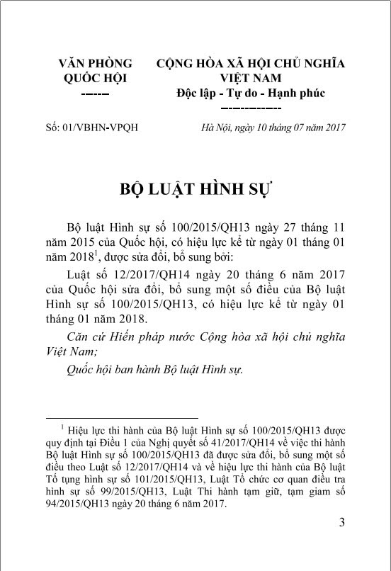Luật số 12/2017/QH14 ngày 20 tháng 6 năm 2017 của Quốc hội sửa đổi, bổ sung một số điều của Bộ luật Hình sự số 100/2015/QH13, có hiệu lực kể từ ngày 01 tháng 01 năm 2018.