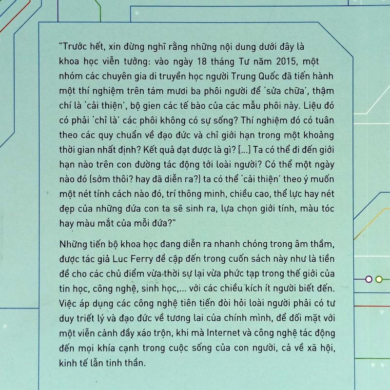 Những tiến bộ khoa học đang diễn ra nhanh chóng trong âm thầm, được tác giả Luc Ferry đề cập đến trong cuốn sách này như là tiền đề cho các chủ điểm vừa thời sự lại vừa phức tạp trong thế giới của tin học, công nghệ, sinh học,.... với các chiều kích ít người biết đến. Việc áp dụng các công nghệ tiên tiến đòi hỏi loài người phải có tư duy triết lý và đạo đức về tương lai của chính mình, để đối mặt với một viễn cảnh đầy xáo trộn, khi mà Internet và công nghệ tác động đến mọi khía cạnh trong cuộc sống của con người, cả về xã hội. kinh tế lẫn tinh thần.