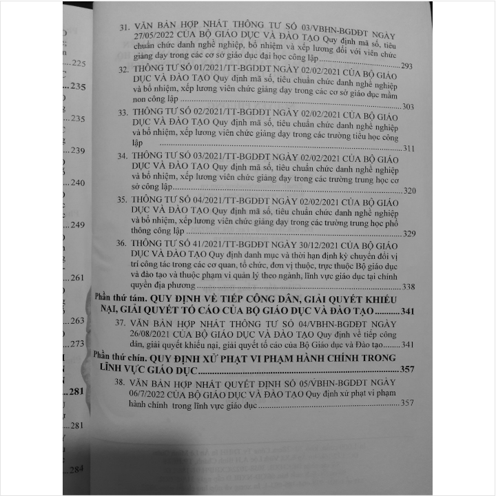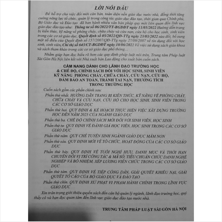 - Toàn bộ sách bìa mềm khổ lớn 20 x 28 cm phân phối bởi Nhà sách Nam Việt đều được bọc sách Plastic MIỄN PHÍ và xuất hóa đơn điện tử đầy đủ, nhanh chóng. …/… Trong sách đã cập nhật các Nghị định và Thông tư mới như sau: - Thông tư số 06/2022/TT-BGDĐT ngày 11/05/2022 Hướng dẫn trang bị kiến thức, kỹ năng về phòng cháy, chữa cháy và cứu nạn, cứu hộ cho học sinh, sinh viên trong các cơ sở giáo dục; - Quyết định số 05/2022/QĐ-TTg ngày 23/03/2022 sửa đổi, bổ sung một số điều của Quyết định số 157/2007/QĐ-TTg ngày 27/09/2007 về tín dụng đối với học sinh, sinh viên; - Chỉ thị số 643/CT-BGDĐT ngày 10/06/2022 về việc sử dụng sách giáo khoa và sách tham khảo trong các cơ sở giáo dục phổ thông… Nhằm phổ biến đến Quý Cơ quan, Đơn vị trường học và Quý khách hàng thân thiết nắm bắt kịp thời những quy định mới nêu trên. Nhà sách Nam Việt xin trân trọng giới thiệu cuốn sách: CẨM NANG CHO LÃNH ĐẠO TRƯỜNG HỌC & CHẾ ĐỘ, CHÍNH SÁCH DÀNH CHO HỌC SINH, SINH VIÊN - KỸ NĂNG PHÒNG CHÁY, CHỮA CHÁY, CỨU NẠN, CỨU HỘ, ĐẢM BẢO AN TOÀN, TRÁNH TAI NẠN, THƯƠNG TÍCH TRONG TRƯỜNG HỌC Cuốn sách gồm các phần chính sau: Phần thứ nhất. HƯỚNG DẪN TRANG BỊ KIẾN THỨC, KỸ NĂNG VỀ PHÒNG CHÁY, CHỮA CHÁY VÀ CỨU NẠN, CỨU HỘ CHO HỌC SINH, SINH VIÊN TRONG CÁC CƠ SỞ GIÁO DỤC Phần thứ hai. QUY ĐỊNH VÀ KẾ HOẠCH THỰC HIỆN VIỆC XÂY DỰNG TRƯỜNG HỌC ĐẾN NĂM 2025 CỦA NGÀNH GIÁO DỤC Phần thứ ba. CHẾ ĐỘ CHÍNH SÁCH MỚI ĐỐI VỚI HỌC SINH, SINH VIÊN Phần thứ tư. QUY ĐỊNH MỚI VỀ VIỆC ĐÁNH GIÁ HỌC VIÊN, HỌC SINH TRONG CÁC CƠ SỞ GIÁO DỤC Phần thứ năm. QUY CHẾ TUYỂN SINH NGÀNH GIÁO DỤC MẦM NON Phần thứ sáu. QUY ĐỊNH MỚI VỀ TỔ CHỨC, HOẠT ĐỘNG CỦA CÁC CƠ SỞ GIÁO DỤC Phần thứ bảy. QUY ĐỊNH VỀ TUỔI NGHỈ HƯU, DANH MỤC VÀ THỜI HẠN CHUYỂN ĐỔI VỊ TRÍ CÔNG TÁC & MÃ SỐ, TIÊU CHUẨN CHỨC DANH NGHỀ NGHIỆP VÀ BỔ NHIỆM, XẾP LƯƠNG VIÊN CHỨC TRONG CÁC CƠ SỞ GIÁO DỤC Phần thứ tám. VĂN BẢN MỚI VỀ TIẾP CÔNG DÂN, GIẢI QUYẾT KHIẾU NẠI, GIẢI QUYẾT TỐ CÁO TRONG TRƯỜNG HỌC Phần thứ chín. QUY ĐỊNH XỬ PHẠT VI PHẠM HÀNH CHÍNH TRONG LĨNH VỰC GIÁO DỤC VÀ ĐÀO TẠO Cảm ơn các bạn đã ghé thăm shop Nhà sách Nam Việt ! Sách Cẩm Nang Dành Cho Lãnh Đạo Trường Học - Chế Độ, Chính Sách Dành Cho Học Sinh, Sinh Viên - Kỹ Năng Phòng Cháy Chữa Cháy, Cứu Nạn Cứu Hộ, Đảm Bảo An Toàn, Tránh Tai Nạn, Thương Tích Trong Trường Học Sách Cẩm Nang Dành Cho Lãnh Đạo Trường Học - Chế Độ, Chính Sách Dành Cho Học Sinh, Sinh Viên - Kỹ Năng Phòng Cháy Chữa Cháy, Cứu Nạn Cứu Hộ, Đảm Bảo An Toàn, Tránh Tai Nạn, Thương Tích Trong Trường Học