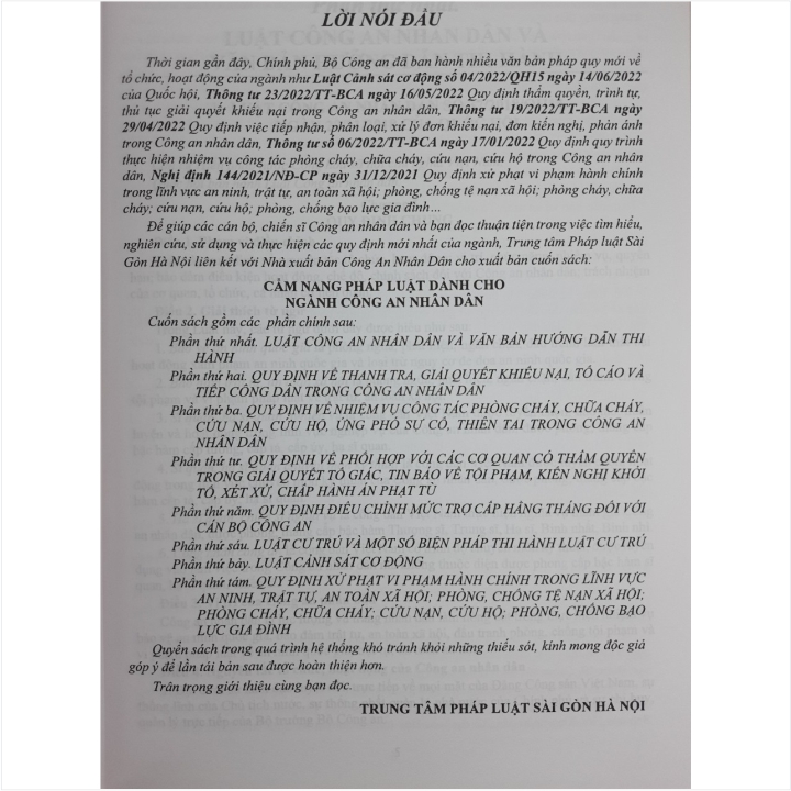 - Thông tư số 06/2022/TT-BCA ngày 17/01/2022 Quy định quy trình thực hiện nhiệm vụ công tác phòng cháy, chữa cháy, cứu nạn, cứu hộ trong Công an nhân dân; - Nghị định 144/2021/NĐ-CP ngày 31/12/2021 Quy định xử phạt vi phạm hành chính trong lĩnh vực an ninh, trật tự, an toàn xã hội; phòng, chống tệ nạn xã hội; phòng cháy, chữa cháy; cứu nạn, cứu hộ; phòng, chống bạo lực gia đình… Nhằm phổ biến đến Quý Cơ quan, Đơn vị và Quý khách hàng thân thiết nắm bắt kịp thời những quy định mới nêu trên. Nhà sách Nam Việt xin trân trọng giới thiệu cuốn sách: Sách CẨM NANG PHÁP LUẬT DÀNH CHO NGÀNH CÔNG AN NHÂN DÂN Nội dung sách gồm 8 phần: Phần thứ nhất. Tìm hiểu LUẬT CÔNG AN NHÂN DÂN VÀ CÁC VĂN BẢN HƯỚNG DẪN THI HÀNH Phần thứ hai. QUY ĐỊNH MỚI VỀ THANH TRA, GIẢI QUYẾT KHIẾU NẠI, TỐ CÁO VÀ TIẾP CÔNG DÂN TRONG CÔNG AN NHÂN DÂN Phần thứ ba. QUY ĐỊNH VỀ NHIỆM VỤ CÔNG TÁC PHÒNG CHÁY, CHỮA CHÁY, CỨU NẠN, CỨU HỘ, ỨNG PHÓ SỰ CỐ, THIÊN TAI TRONG CÔNG AN NHÂN DÂN Phần thứ tư. QUY ĐỊNH VỀ PHỐI HỢP VỚI CÁC CƠ QUAN CÓ THẨM QUYỀN TRONG GIẢI QUYẾT TỐ GIÁC, TIN BÁO VỀ TỘI PHẠM, KIẾN NGHỊ KHỞI TỐ, XÉT XỬ, CHẤP HÀNH ÁN PHẠT TÙ Phần thứ năm. QUY ĐỊNH ĐIỀU CHỈNH MỨC TRỢ CẤP HẰNG THÁNG ĐỐI VỚI CÁN BỘ CÔNG AN Phần thứ sáu. Tìm hiểu LUẬT CƯ TRÚ VÀ MỘT SỐ BIỆN PHÁP THI HÀNH LUẬT CƯ TRÚ Phần thứ bảy. Tìm hiểu LUẬT CẢNH SÁT CƠ ĐỘNG Phần thứ tám. QUY ĐỊNH MỚI VỀ XỬ PHẠT VI PHẠM HÀNH CHÍNH TRONG LĨNH VỰC AN NINH, TRẬT TỰ, AN TOÀN XÃ HỘI; PHÒNG, CHỐNG TỆ NẠN XÃ HỘI; PHÒNG CHÁY, CHỮA CHÁY; CỨU NẠN, CỨU HỘ; PHÒNG, CHỐNG BẠO LỰC GIA ĐÌNH Cảm ơn các bạn đã ghé thăm shop Nhà sách Nam Việt ! CẨM NANG PHÁP LUẬT DÀNH CHO NGÀNH CÔNG AN NHÂN DÂN CẨM NANG PHÁP LUẬT DÀNH CHO NGÀNH CÔNG AN NHÂN DÂN