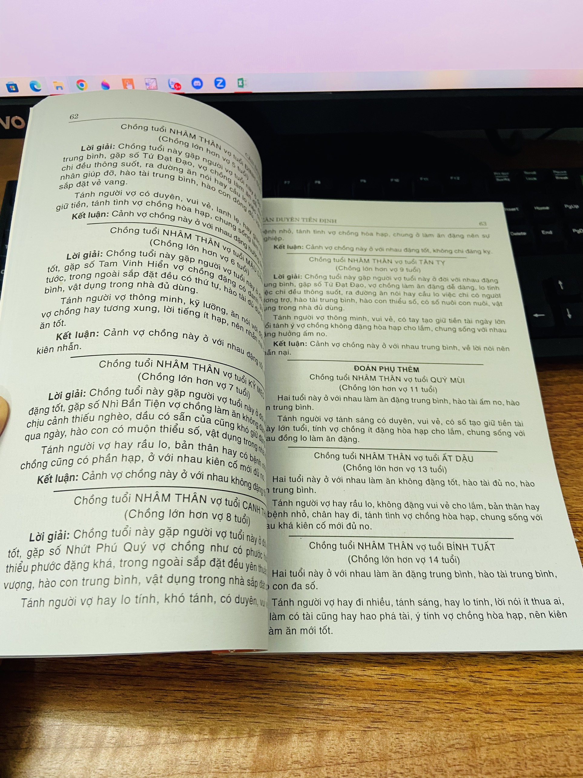 Cuốn sách là cuốn tử vi tình duyên kinh điển xuất bản năm 1952. Nội dung chuyên sâu về xem tuổi vợ chồng hợp, khắc dựa theo tuổi, năm sinh, bản mệnh.