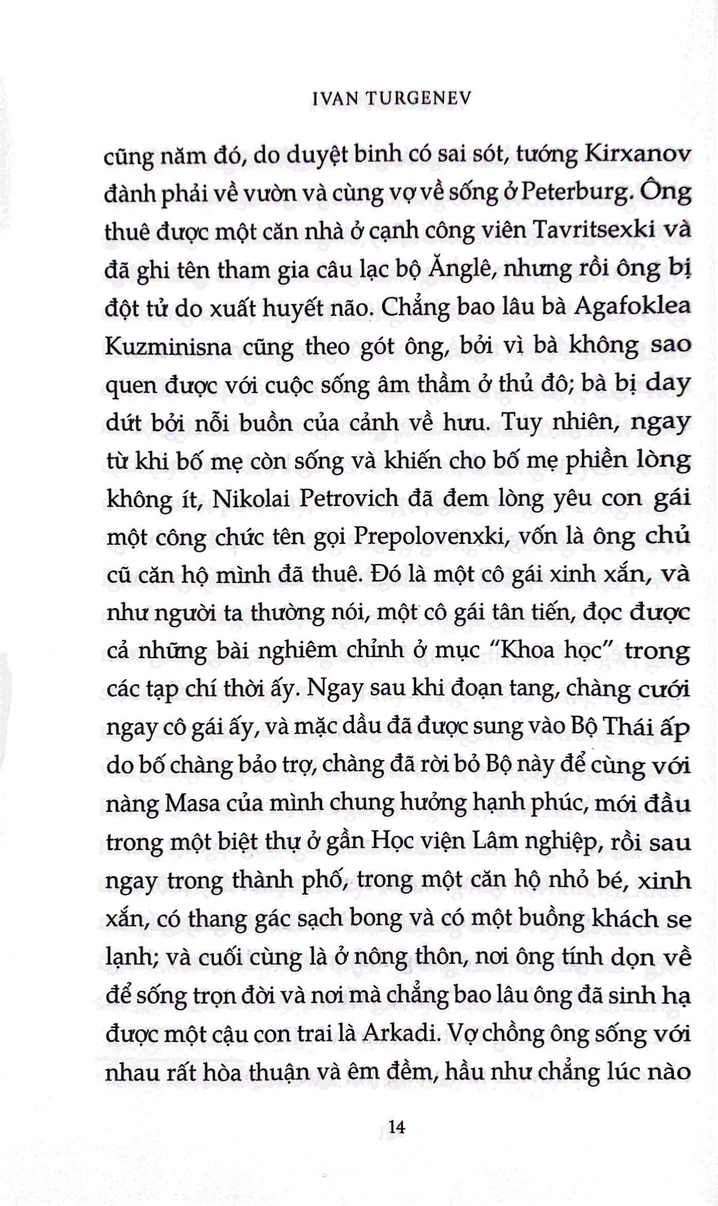Khi Arkadi, chàng sinh viên mới tốt nghiệp về nhà, cha và ông bác quý tộc của cậu đã khó chịu xiết bao với một người bạn lạ hoắc đi theo. Đó là Bazarov, kẻ nổi loạn, kẻ dám “không thừa nhận bất cứ quyền uy nào, cũng như chẳng chấp nhận một nhân tố nhỏ nhoi nào về đức tin”. Kiệt tác của Turgenev về xung đột giữa các thế hệ đã làm nước Nga bị sốc khi xuất bản lần thứ nhất vào năm 1862 và ngày nay vẫn còn nguyên sự tươi mới, trực tiếp, kích động như đã luôn như vậy với những độc giả lần đầu chạm trán mẫu nhân vật hư vô nổi tiếng của nó.