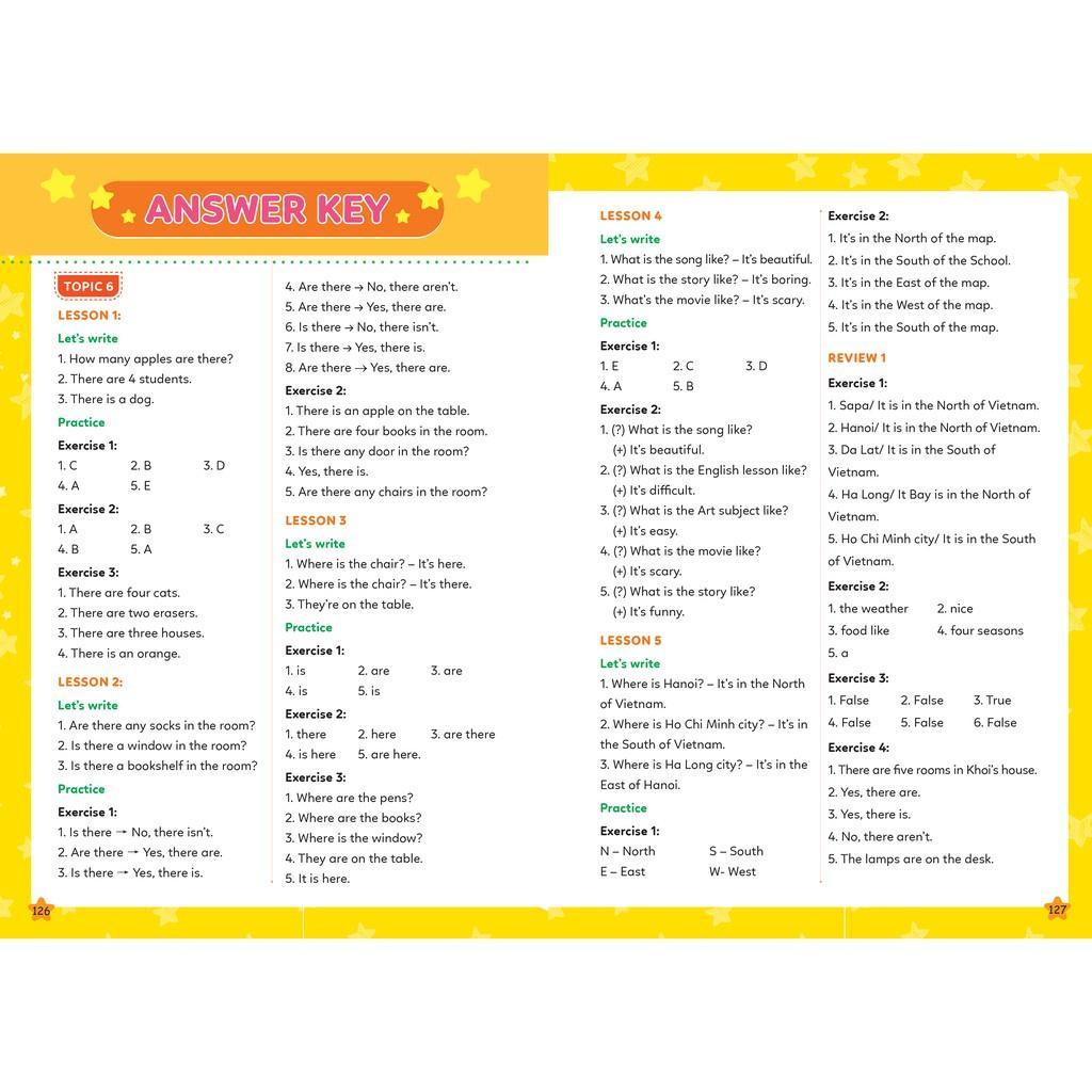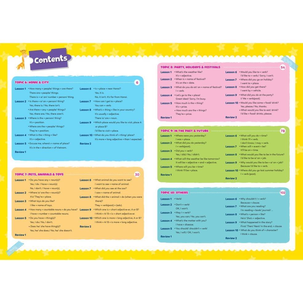- Nội dung ngắn gọn, dễ học: 100 cấu trúc được gói gọn trong 10 chủ đề, mỗi chủ đề bao gồm 10 bài học Với các chủ đề quen thuộc và gần gũi trong cuộc sống như Greetings, Family & Friends, Study & School… không chỉ giúp các em tiếp thu kiến thức Ngữ pháp hiệu quả hơn mà còn biết cách vận dụng vào giao tiếp thực tế hàng ngày.