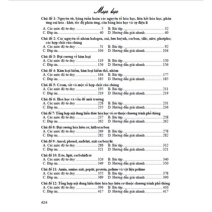 CHINH PHỤC CÂU HỎI LÍ THUYẾT HÓA HỌC THEO CHỦ ĐỀ Cuốn sách được chia làm 12 chủ đề kiến thức theo đúng ma trận đề thi THPT quốc gia. Trong mỗi chủ đề chúng tôi đều đưa ra các câu hỏi từ dễ đến khó với các mức độ tư duy từ thấp đến cao để các em rèn luyện năng lực tư duy của mình đồng thời cũng phù hợp với mỗi đối tượng học sinh. Các em chỉ thi tốt nghiệp thì làm các câu hỏi ở mức độ nhận biết, thông hiểu. Các em dùng kết quả để xét tuyển vào các trường Đại học và Cao đẳng thì cần làm thêm các câu hỏi ở mức độ vận dụng và vận dụng cao.
