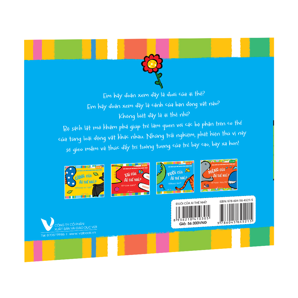 Đặc biệt, cuốn sách được biên soạn song ngữ Việt – Anh, không chỉ giúp trẻ làm quen với cơ thể động vật mà còn mở ra cánh cửa khám phá ngôn ngữ mới mẻ. Hãy để “ĐUÔI CỦA AI THẾ NHỈ? - Whose tail?” trở thành người bạn đồng hành tuyệt vời trong cuộc phiêu lưu tìm hiểu thế giới động vật của bé!