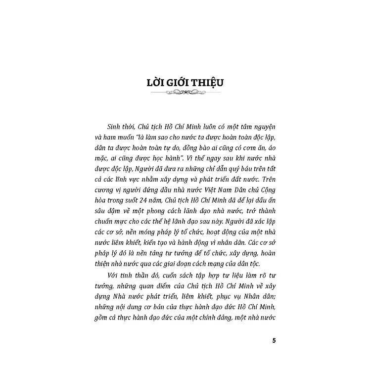 Sách tập hợp những tư liệu làm rõ tư tưởng, quan điểm của Chủ tịch Hồ Chí Minh về xây dựng Nhà nước Việt Nam hiện đại, phát triển, liêm khiết, phục vụ Nhân dân; xây dựng Đảng xứng đáng “là đạo đức”, “là văn minh”, đủ sức chèo lái, đưa đất nước phát triển phồn vinh, hạnh phúc theo tâm nguyện của Người.