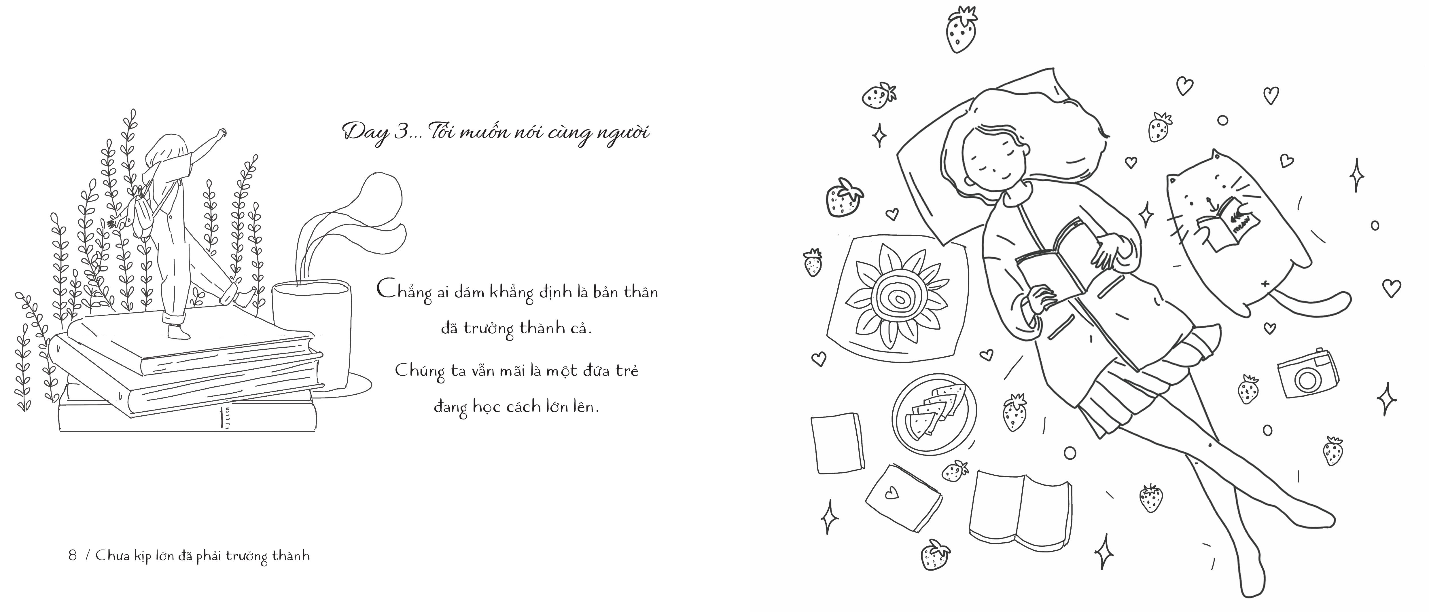 “Chưa kịp lớn đã phải trưởng thành” nay đã có phiên bản tô màu, kết hợp những lời tâm tình thủ thỉ với những bức tranh sinh động, dịu dàng. Cuốn sách như một món quà dành tặng bạn, để bạn tự tạo nên màu sắc tươi sáng tích cực, thỏa sức tô vẽ cảm xúc trên hành trình trưởng thành chênh vênh và ấp ôm bạn cùng đi qua những tháng ngày mỏi mệt.