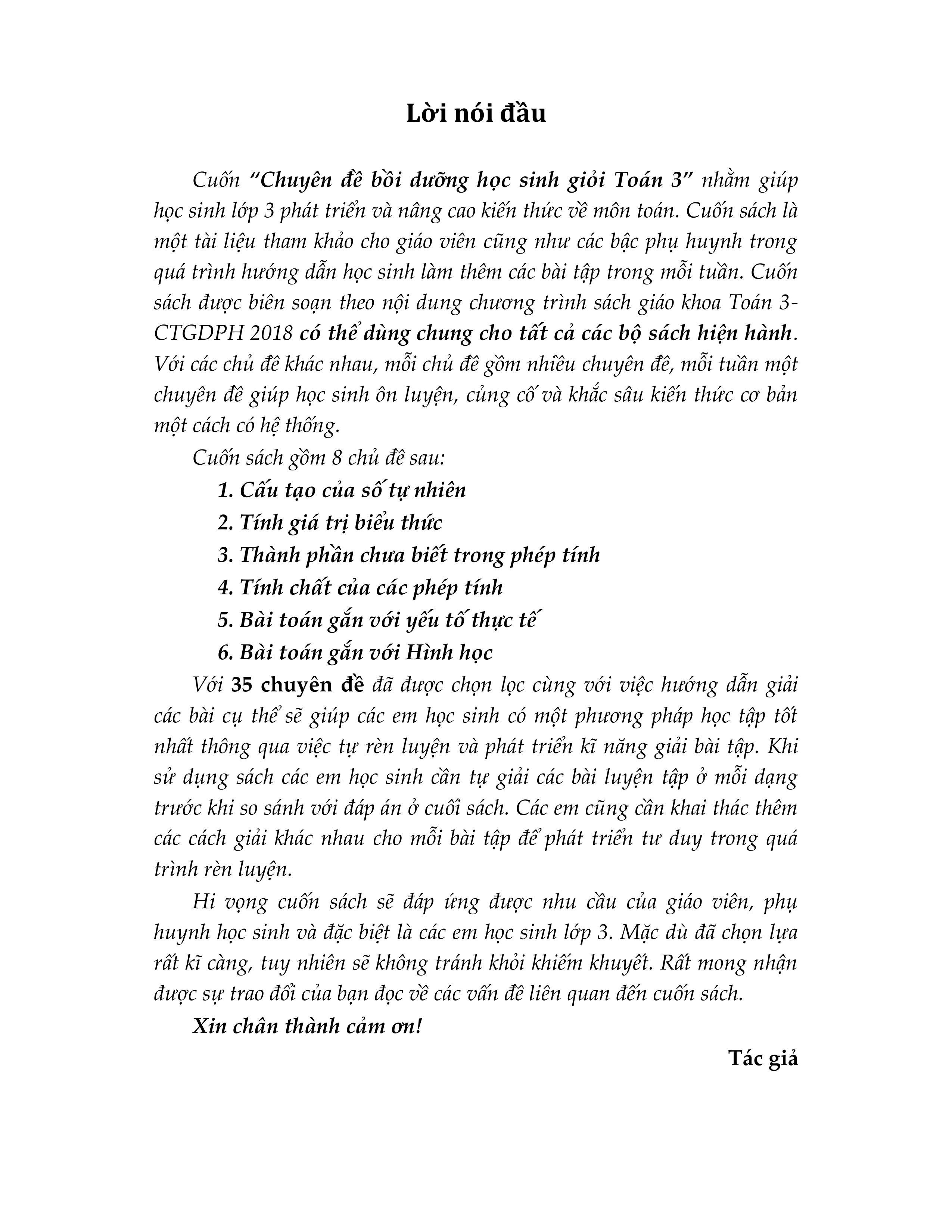 Cuốn Chuyên Đề Bồi Dưỡng Học Sinh Giỏi Toán 3 nhằm giúp học sinh lớp 3 phát triển và nâng cao kiến thức môn toán. Cuốn sách là Cuốn “Chuyên đề bồi dưỡng học sinh giỏi Toán 3” một tài liệu tham khảo cho giáo viên cũng như các bậc phụ huynh trong quá trình hướng dẫn học sinh làm thêm các bài tập trong mỗi tuần. Cuốn sách được biên soạn theo nội dung chương trình sách giáo khoa Toán 3 - CTGDPH 2018 có thể dùng chung cho tất cả các bộ sách hiện hành. Với các chủ đề khác nhau , mỗi năm gồm nhiều chuyên đề, mỗi tuần một chuyên đề giúp học sinh ôn luyện, củng cố và khắc sâu kiến thức cơ bản. Cuốn sách gồm 6 chủ đề sau: Cấu tạo của số tự nhiên Tính giá trị biểu thức Thành phần chưa biết trong phép tính Tính chất của các phép tính Bài toán gắn với yếu tố thực tế Bài toán gắn với Hình học Với 35 chuyên đề đã được chọn lọc cùng với việc hướng dẫn giải các bài cụ thể sẽ giúp các em học sinh có một phương pháp học tập tốt nhất thông qua việc tự rèn luyện và phát triển kĩ năng giải bài tập. Khi sử dụng sách các em học sinh cần tự giải các bài luyện tập ở mỗi dạng trước khi so sánh với đáp án ở cuối sách. Các em cũng cần khai thác thêm các cách giải khác nhau cho mỗi bài tập để phát triển tư duy trong quá trình rèn luyện. Hi vọng cuốn sách sẽ đáp ứng được nhu cầu của giáo viên, phụ huynh học sinh và đặc biệt là các em học sinh lớp 3.