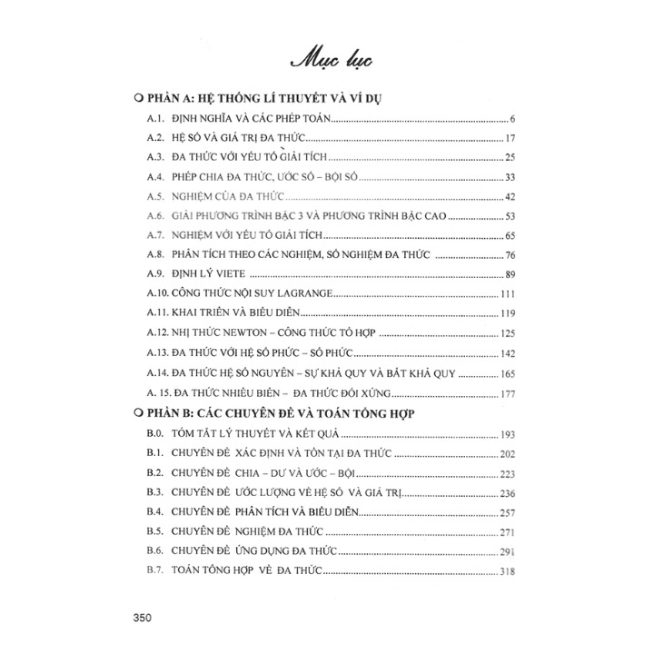 • Phần A là lí thuyết kèm theo khoảng 250 ví dụ cơ bản của 15 chuyên mục từ Đa thức với các phép toán đại số đơn giản đến đa thức hệ số phức, đa thức nhiều biến.
