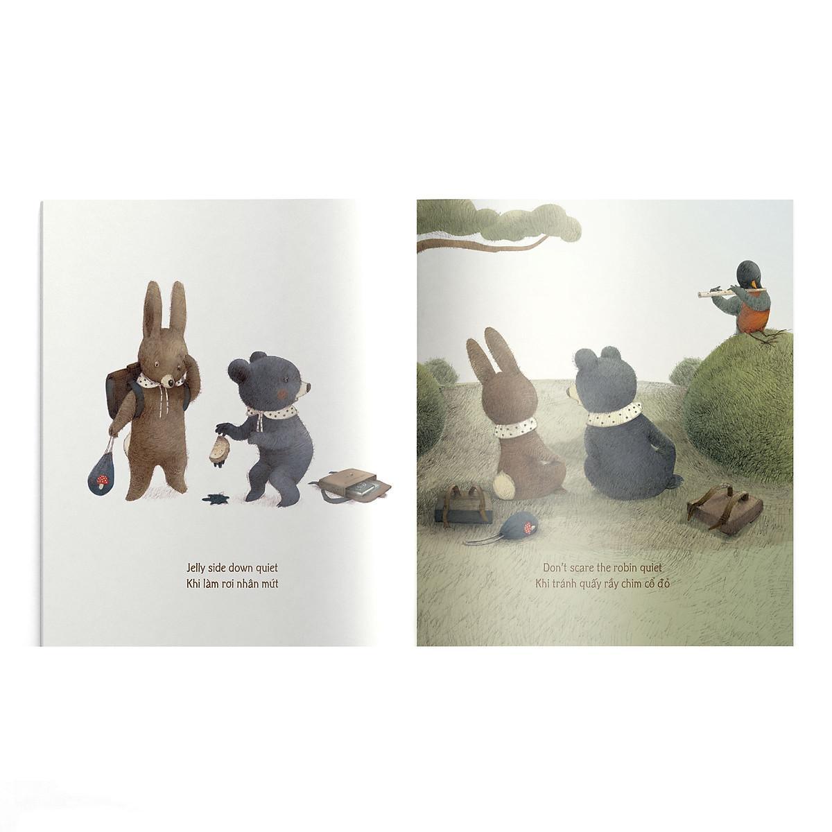 Cuốn sách là bộ sưu tập những khoảng lặng mà bất kỳ ai cũng có thể bắt gặp trong đời: khi là người đầu tiên thức giấc, khi rỉ tai nhau những bí mật, khi chăm chú tô màu… Và còn những khoảnh khắc im lặng nào khác nữa, mời các em cùng khám phá nhé.