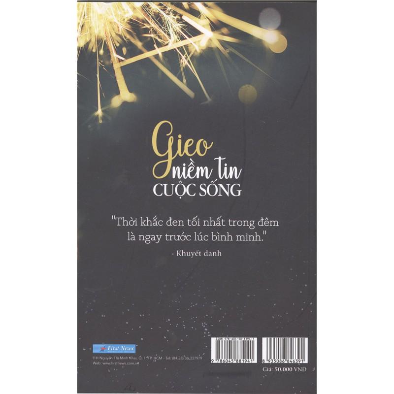 - GIEO NIỀM TIN CUỘC SỐNG Công ty phát hành: First News - Trí Việt Tác Giả: Nhiều tác giả Ngày phát hành: 2020 Số trang: 200 trang Kích thước: 13 x 20.5 cm NXB: NXB Tổng hợp Xuất xứ: Trong nước Ngôn ngữ: Tiếng Việt Mô tả sản phẩm: “Gieo Niềm Tin Cuộc Sống” cũng mong muốn gửi đến bạn đọc một thông điệp như thế. Cuốn sách mà bạn đang cầm trên tay là tập hợp những mẩu chuyện ngắn, súc tích mà cảm động – một vài trong số đó là những câu chuyện có thật. Chỉ là những trang viết ngắn ngủi nhưng thật sự ẩn chứa sức mạnh bằng ngàn lời an ủi, động viên. Với món quà bé nhỏ, giản dị này, First News mong muốn phần nào có thể đồng cảm, chia sẻ với những ai đang chịu bất hạnh hay đang gặp hoàn cảnh kém may mắn… cũng như hy vọng mang đến cho bạn tia sáng của niềm tin, điểm tựa của tinh thần. Ý nghĩa tiềm ẩn đằng sau những câu chuyện nhỏ trong cuốn sách này là giúp bạn tìm lại được chính mình và trưởng thành từ nỗi đau. "Hướng về phía mặt trời, bóng tối sẽ khuất sau lưng; khi trời tối bạn sẽ thấy những vì sao" – hãy luôn nhớ rằng niềm tin là điều quý giá cần giữ gìn nhất trong cuộc sống của tất cả chúng ta!